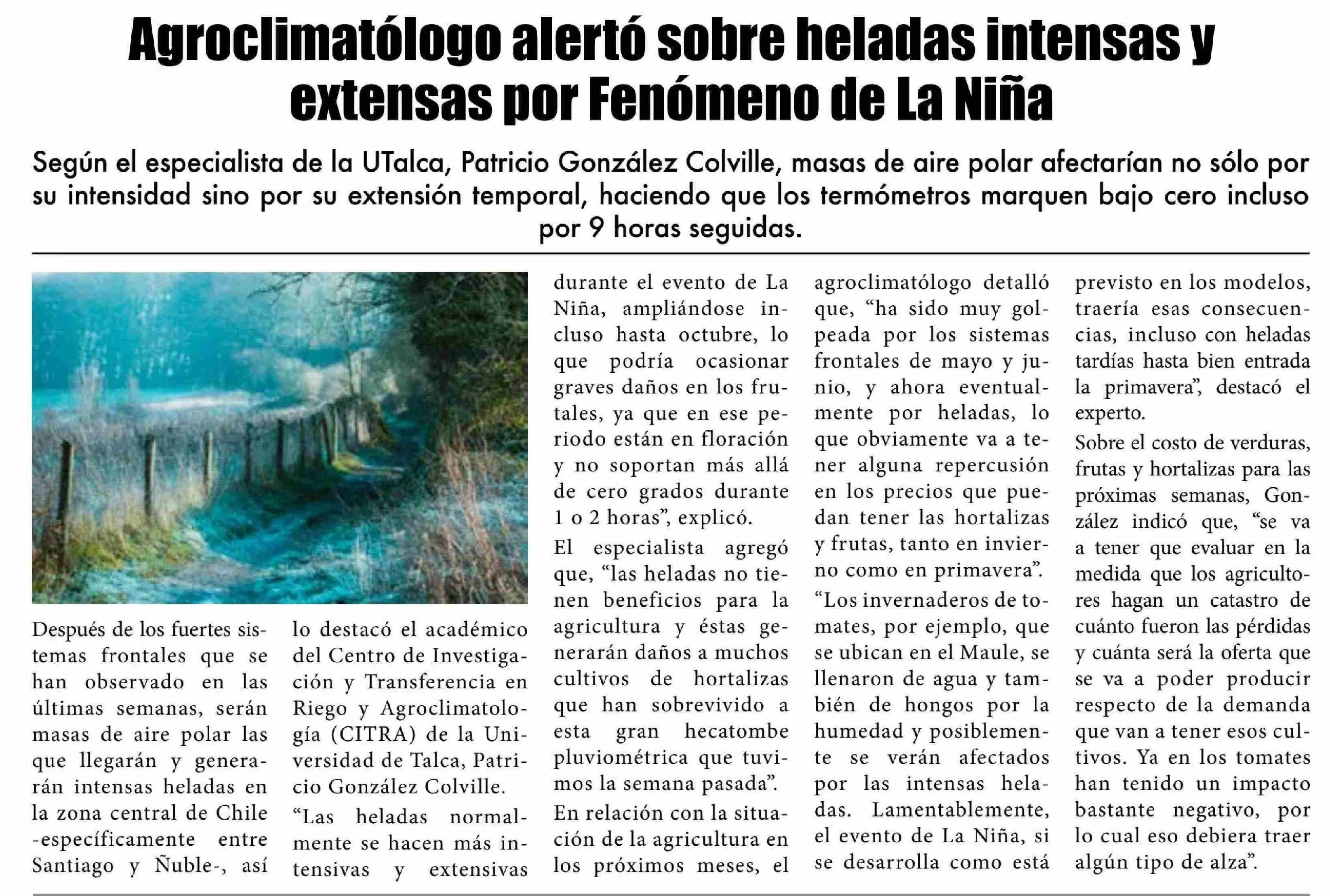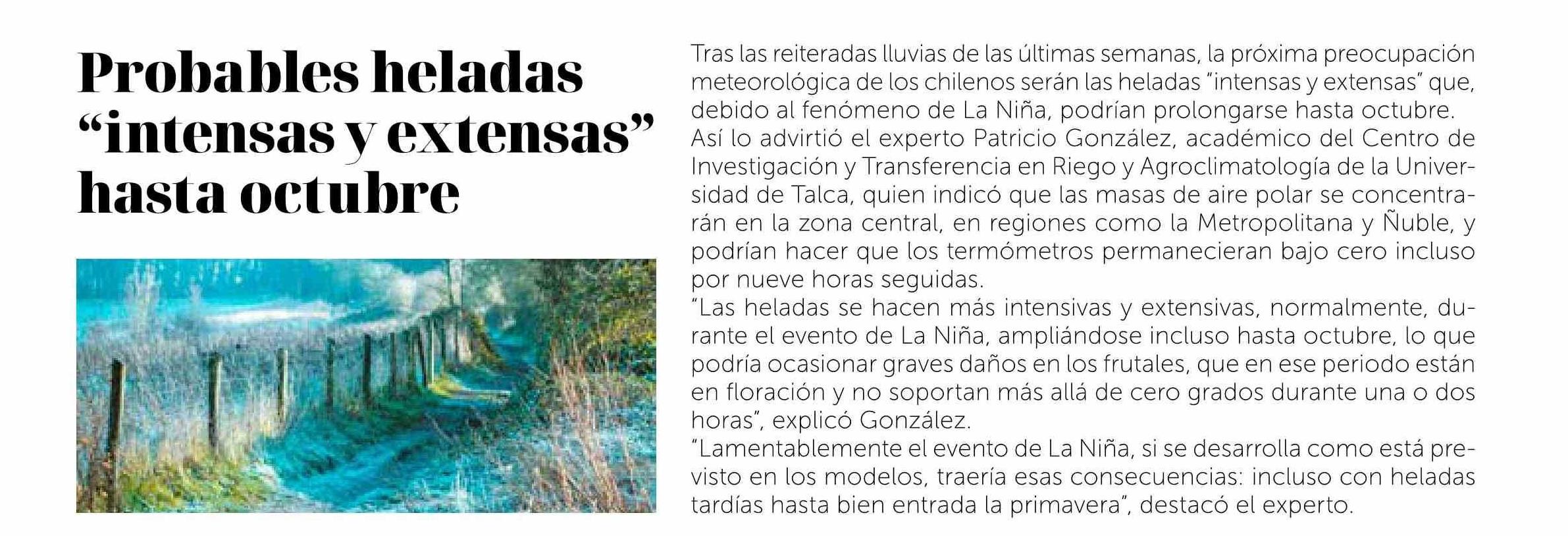 Zona central: Las masas de aire polar llegarán con intensas heladas. Se refiere Patricio González Colville, agroclimatólogo y académico del Centro de Investigación y Transferencia en Riego y Agroclimatología (CITRA).