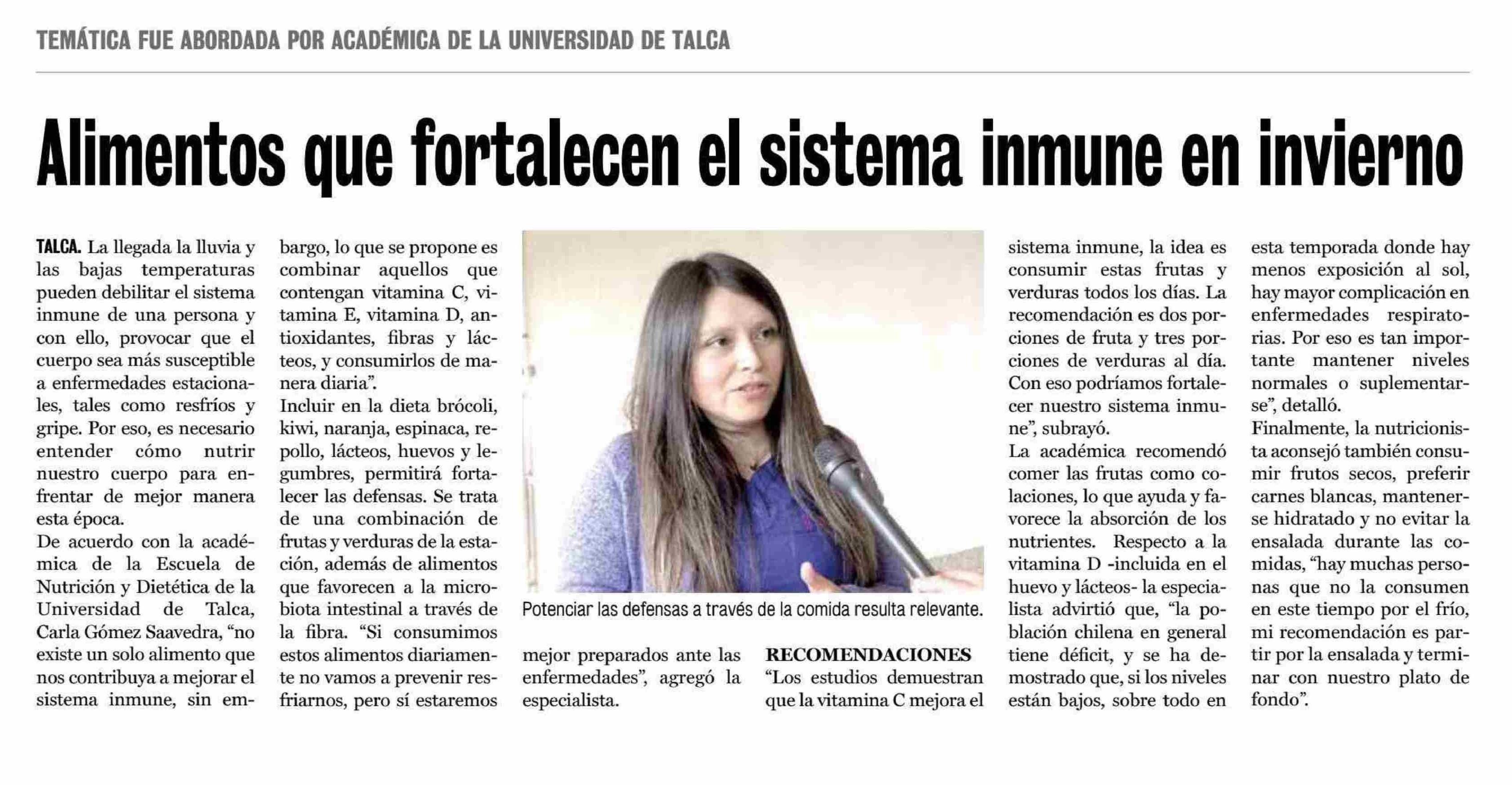 Alimentos que fortalecen el sistema inmune en invierno. Se refiere Carla Gómez Saavedra, académica de la Escuela de Nutrición y Dietética.
