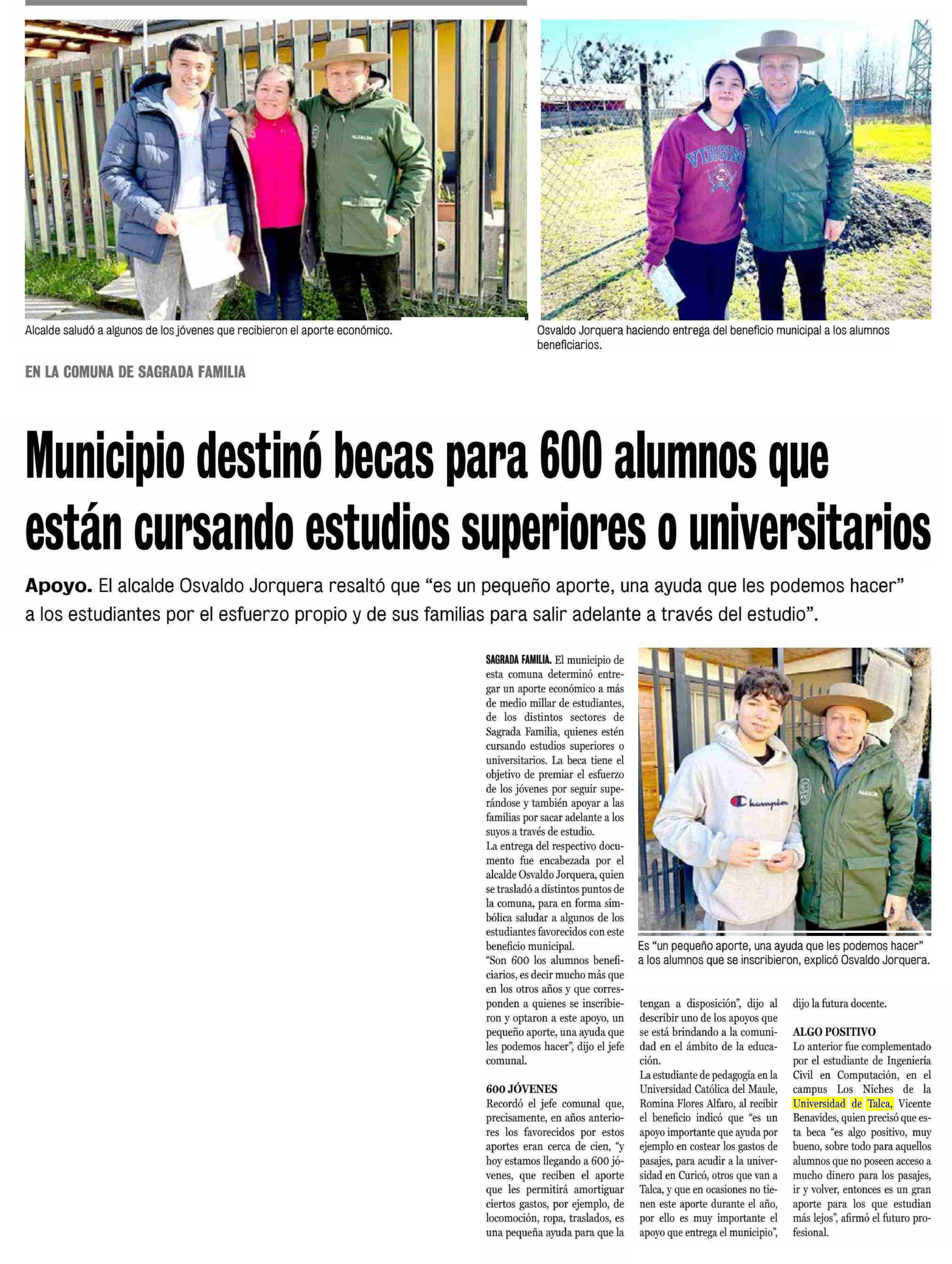 Municipio destinó becas para 600 alumnos que están cursando estudios superiores o universitarios. Se menciona la Universidad de Talca.