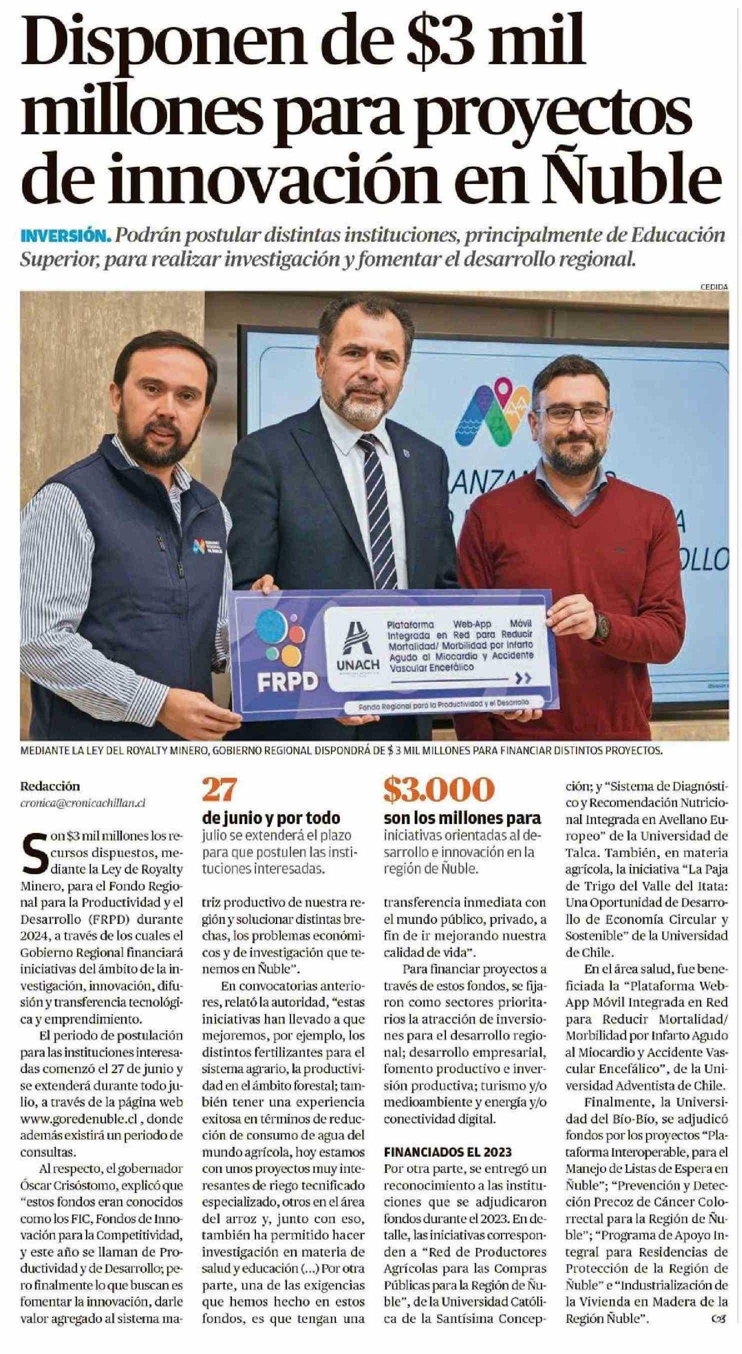 Disponen de $3 mil millones para proyectos de innovación en Ñuble. Se menciona la Universidad de Talca.