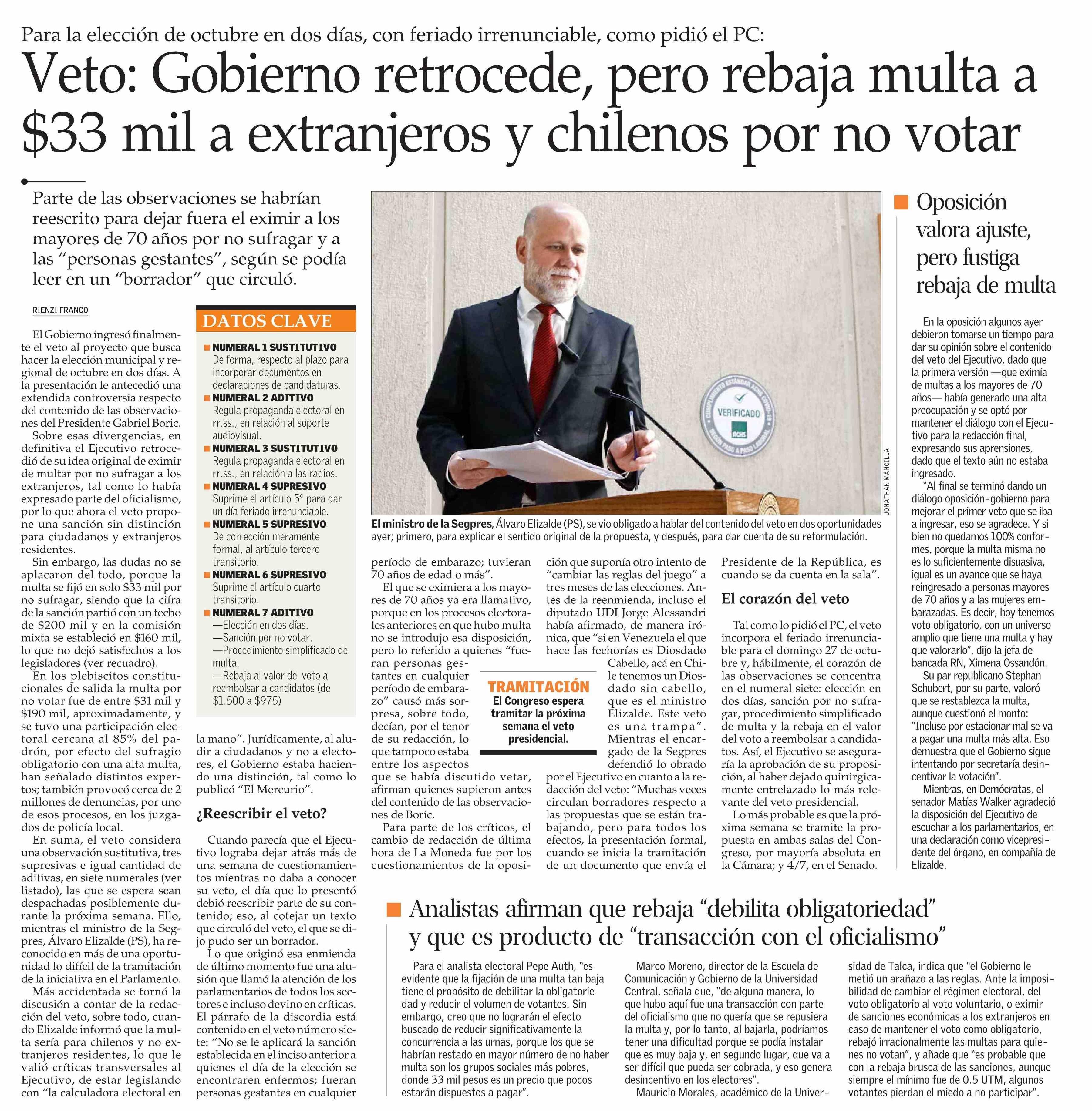 Veto: Gobierno retrocede, pero rebaja multa a $33 mil a extranjeros y chilenos por no votar. Se refiere Mauricio Morales Quiroga, director del Centro de Análisis Político (CAP-UTalca).