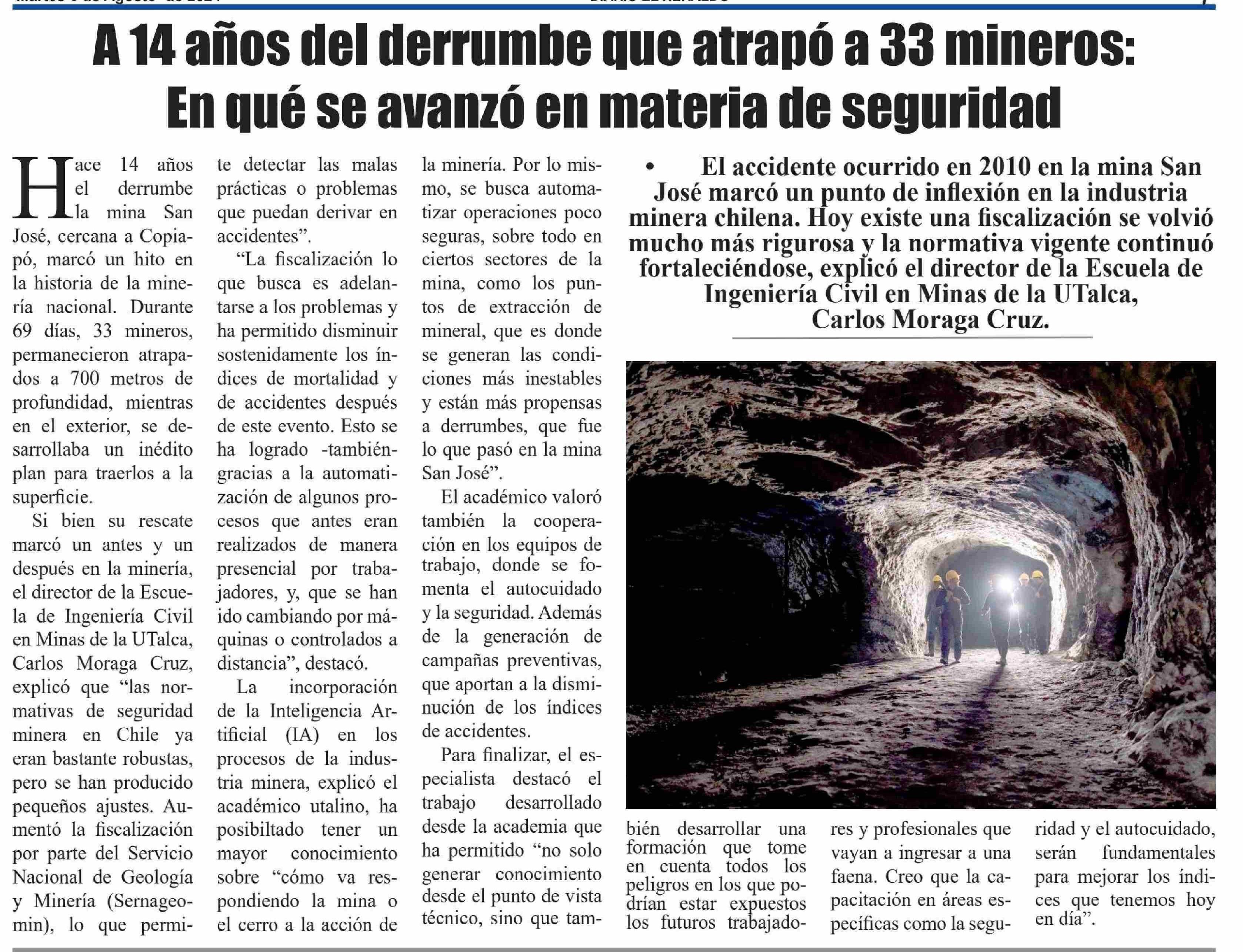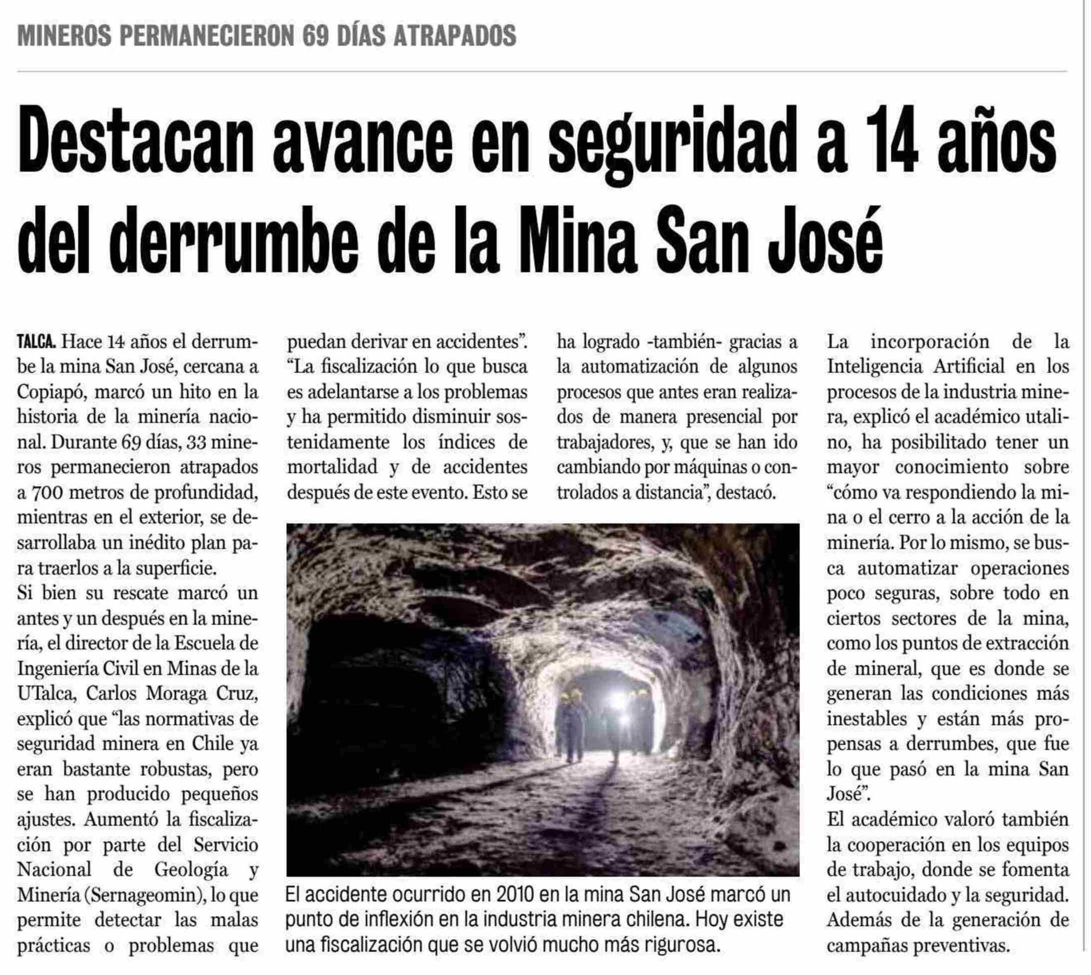 A 14 años del derrumbe que atrapó a 33 mineros: En qué se avanzó en materia de seguridad. Se refiere Carlos Moraga Cruz, director de la Escuela de Ingeniería Civil de Minas.
