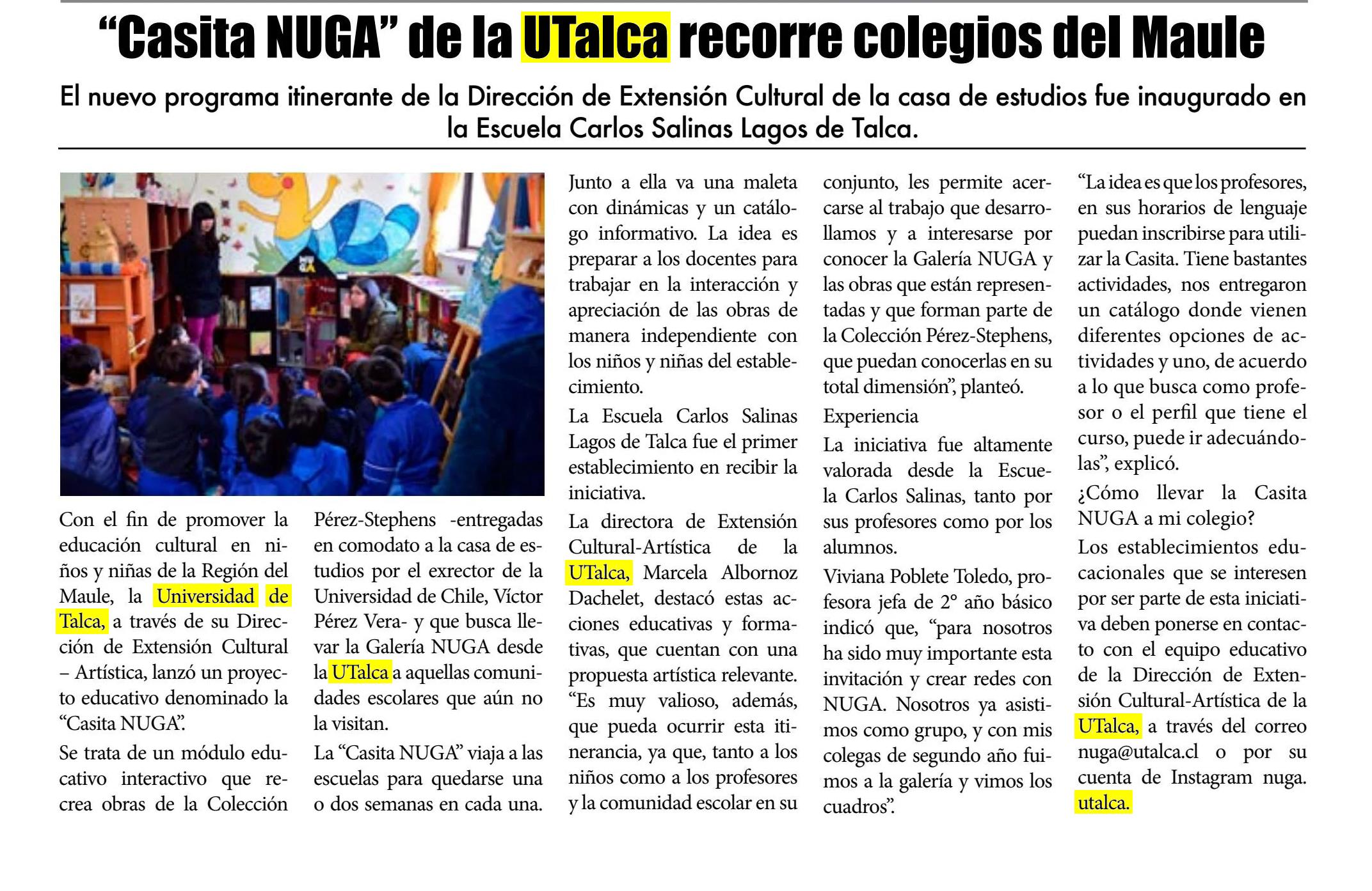 “Casita NUGA” de la UTalca recorre colegios del Maule. Se refiere Marcela Albornoz Dachelet, directora de Extensión Cultural-Artística.