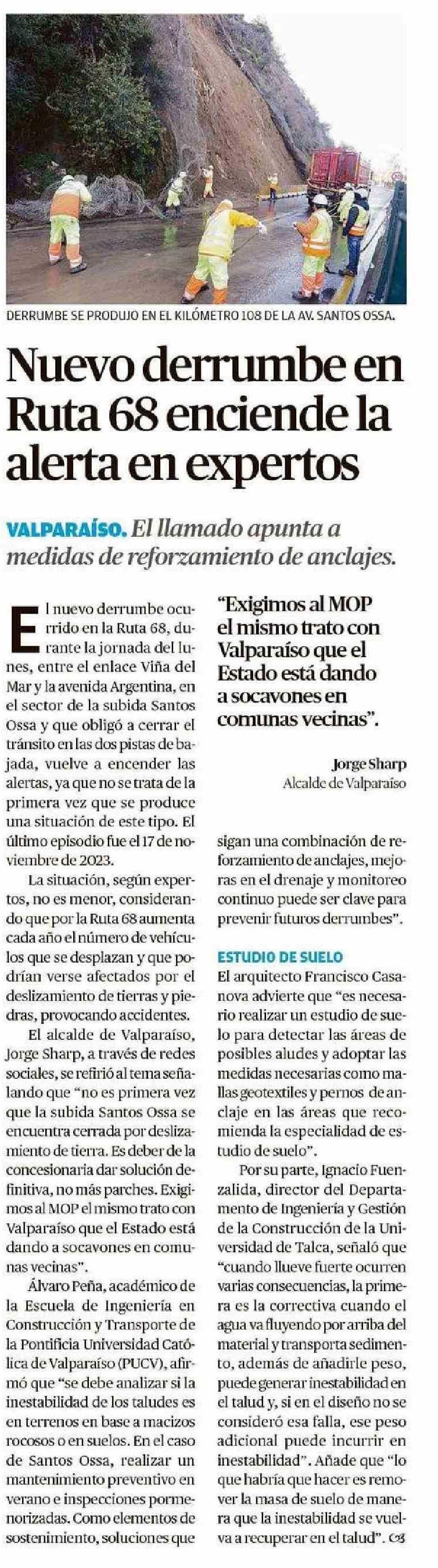 Nuevo derrumbe en Ruta 68 enciende la alerta en expertos. Se refiere Ignacio Fuenzalida, director del Departamento de Ingeniería y Gestión dela Construcción.
