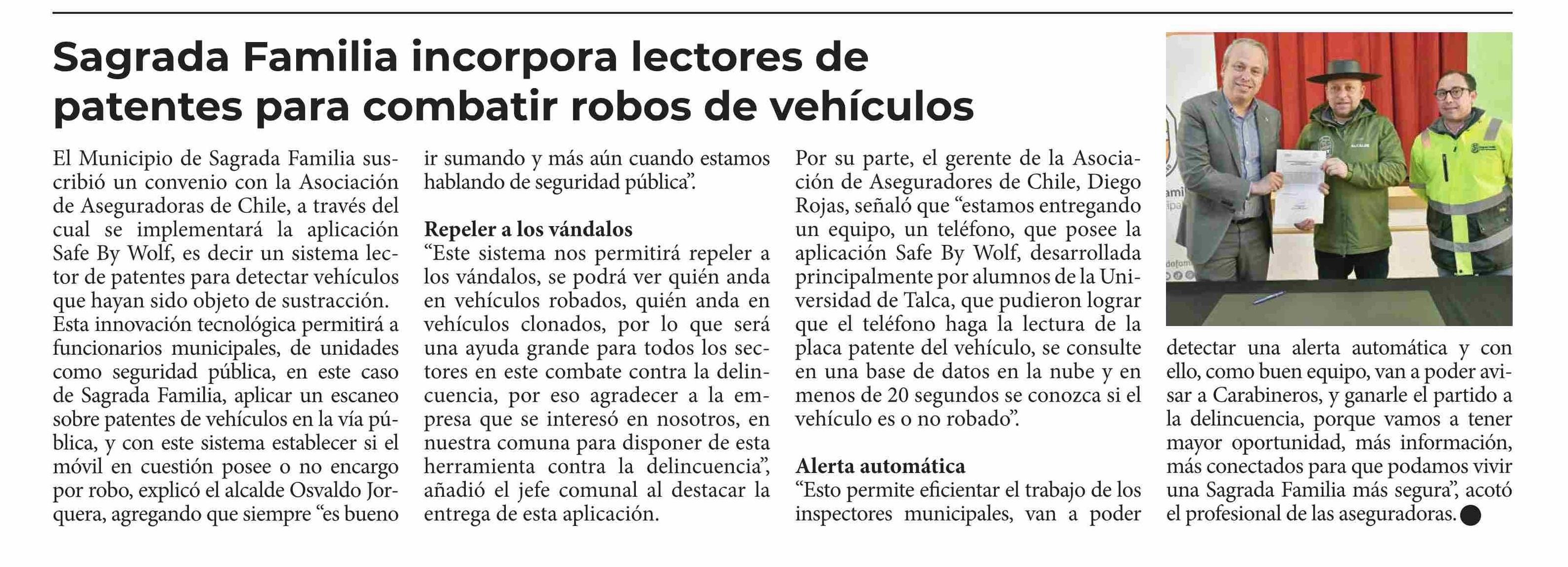 Sagrada Familia incorpora lectores de patentes para combatir robos de vehículos. Se menciona la Universidad de Talca.