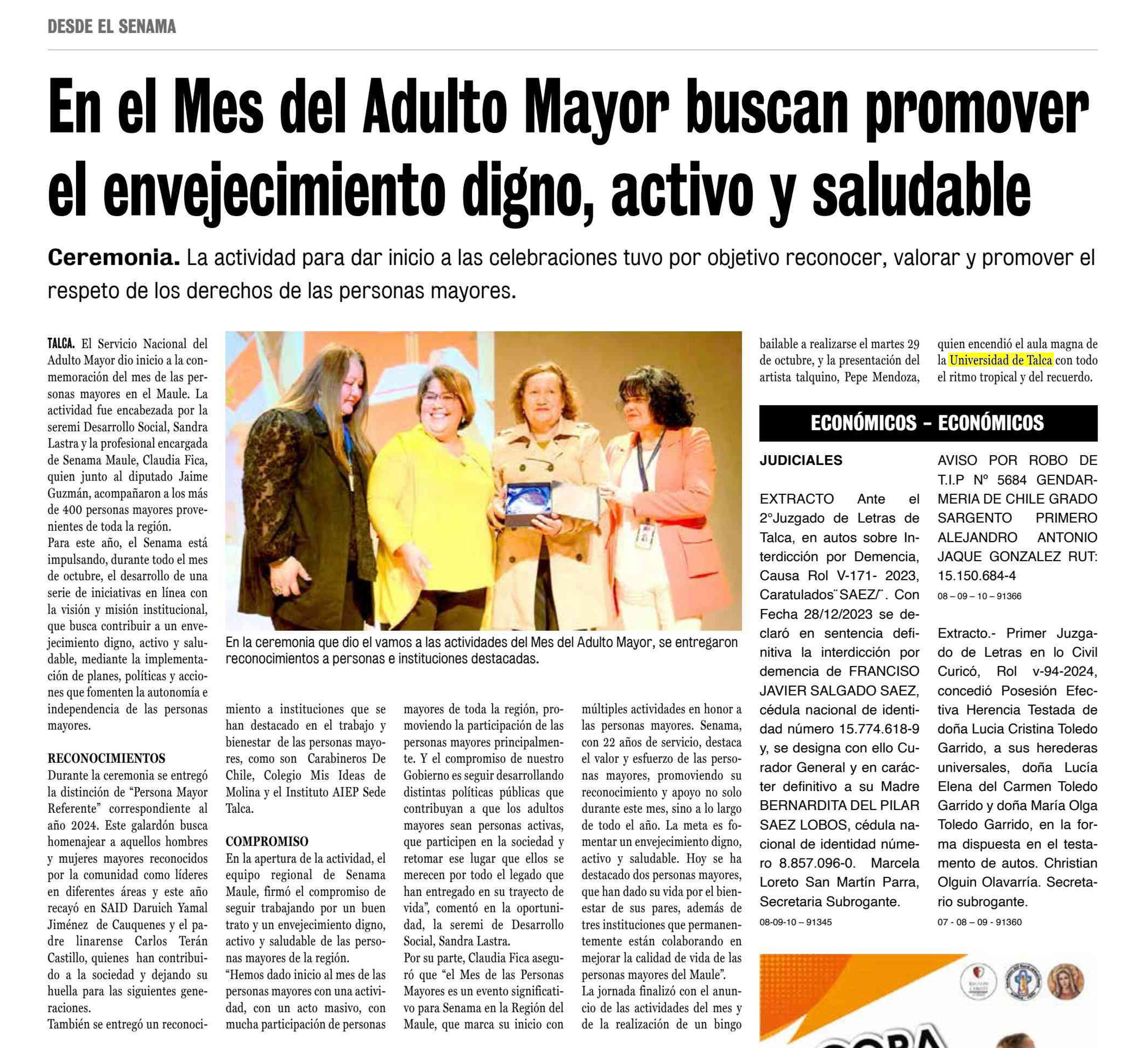 Senama Maule da inicio al mes de las personas mayores promoviendo el Envejecimiento digno, activo y saludable. Se menciona la Universidad de Talca.