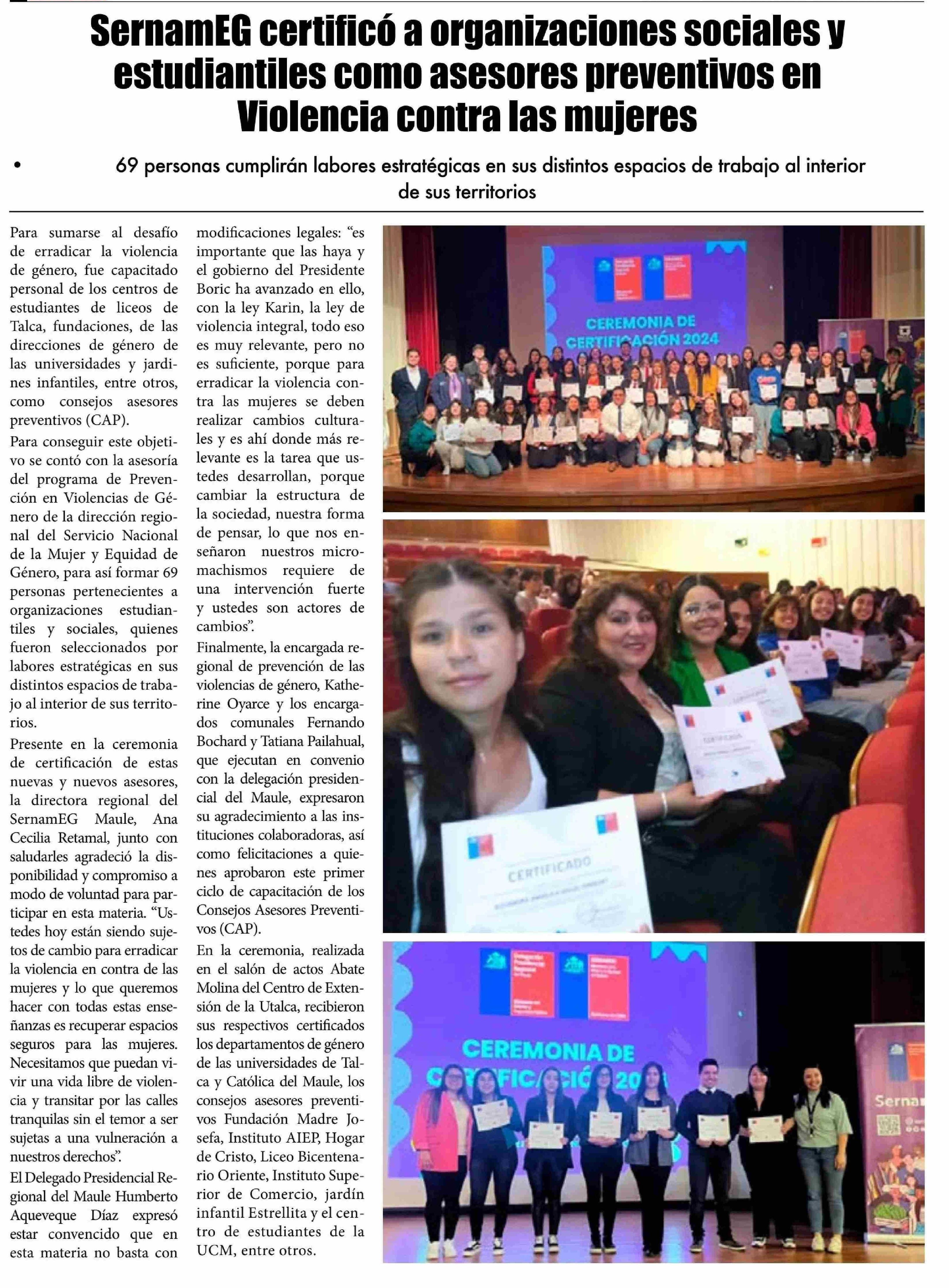 SernamEG certificó a organizaciones sociales y estudiantiles como asesores preventivos en Violencia contra las mujeres. Se menciona la Universidad de Talca.