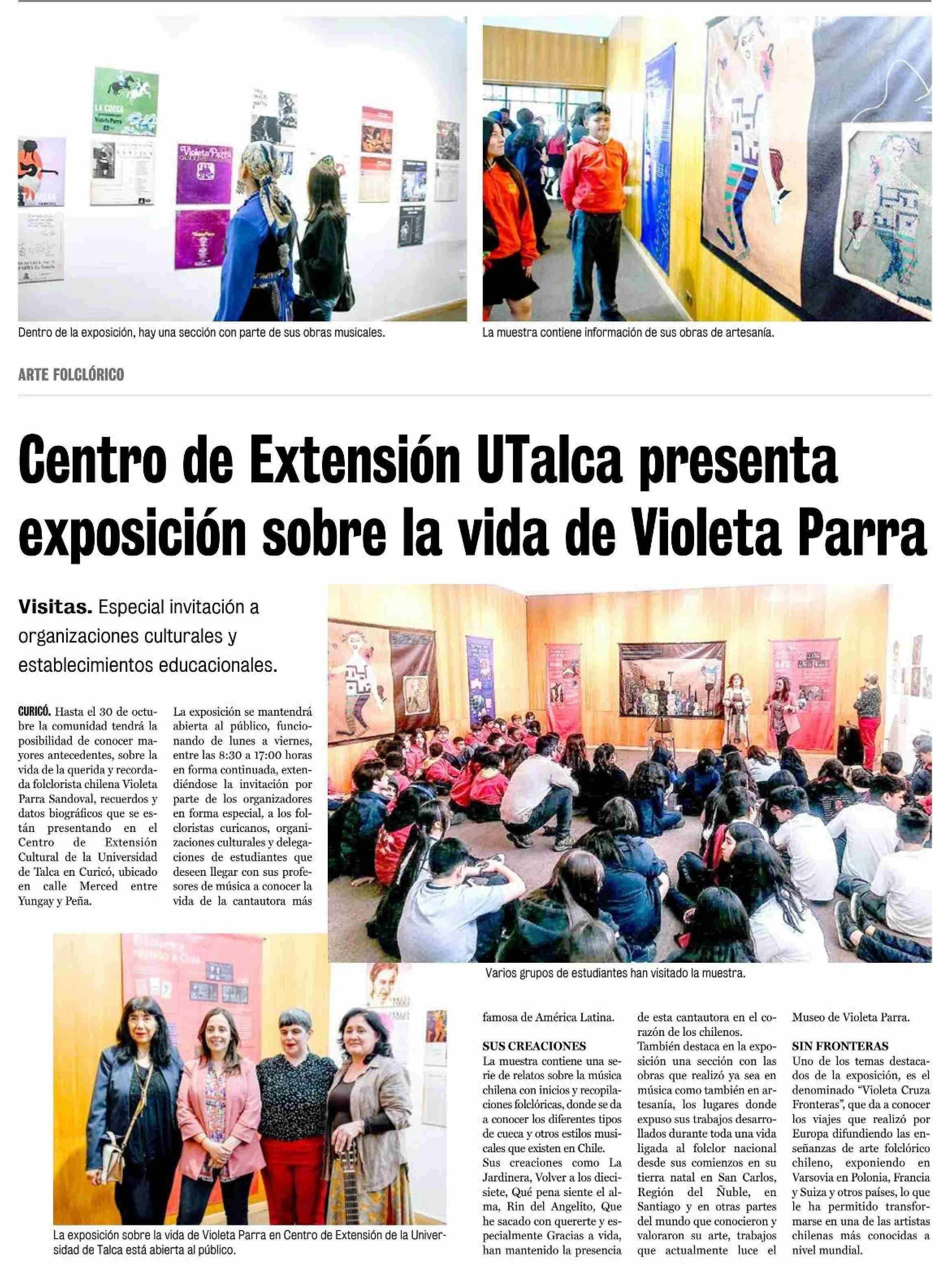 Centro de Extensión UTalca presenta exposición sobre la vida de Violeta Parra. Se menciona la Universidad de Talca.