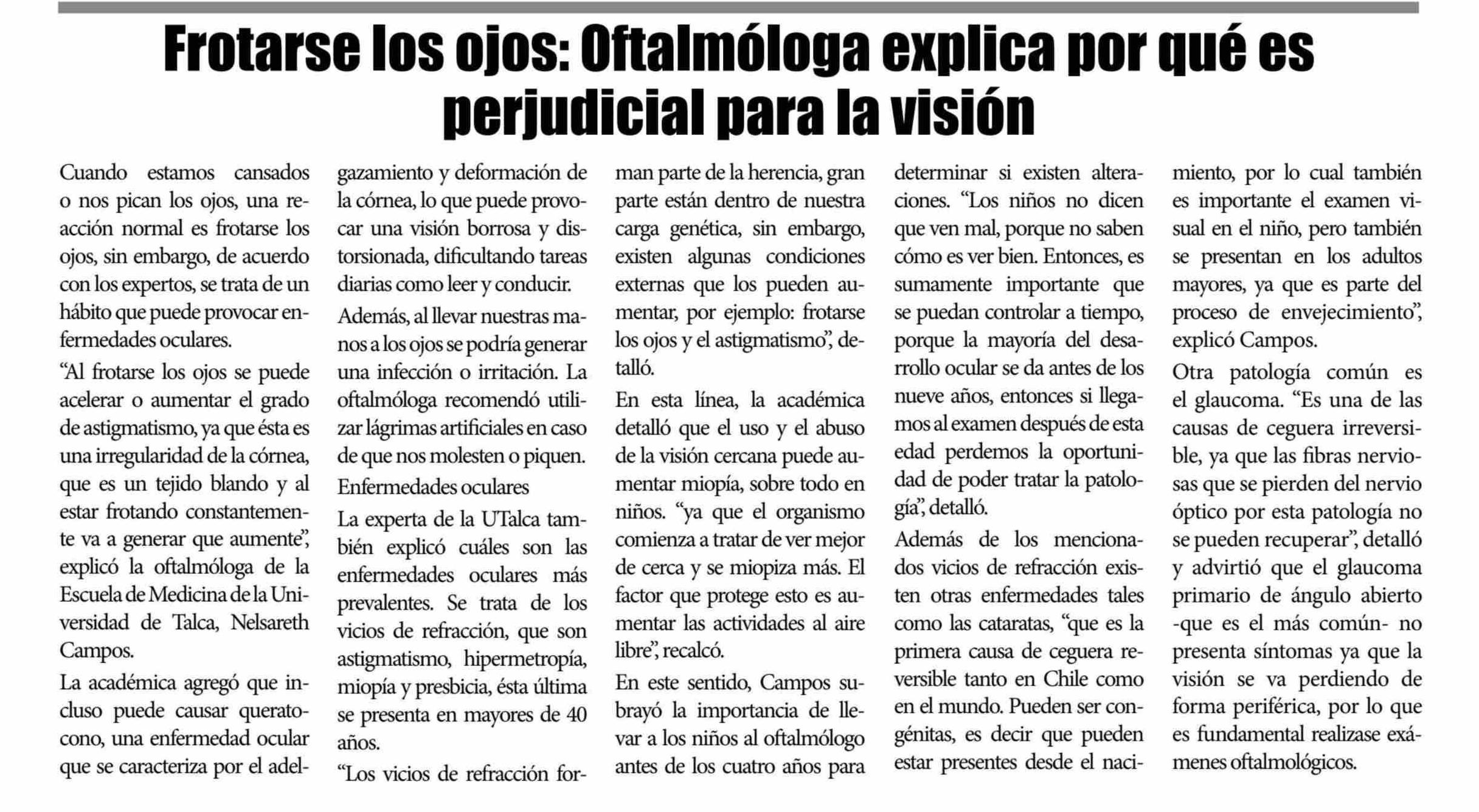 Frotarse los ojos: Oftalmóloga explica por qué es perjudicial para la visión. Se refiere Nelsareth Campos, académica de la Escuela de Medicina.