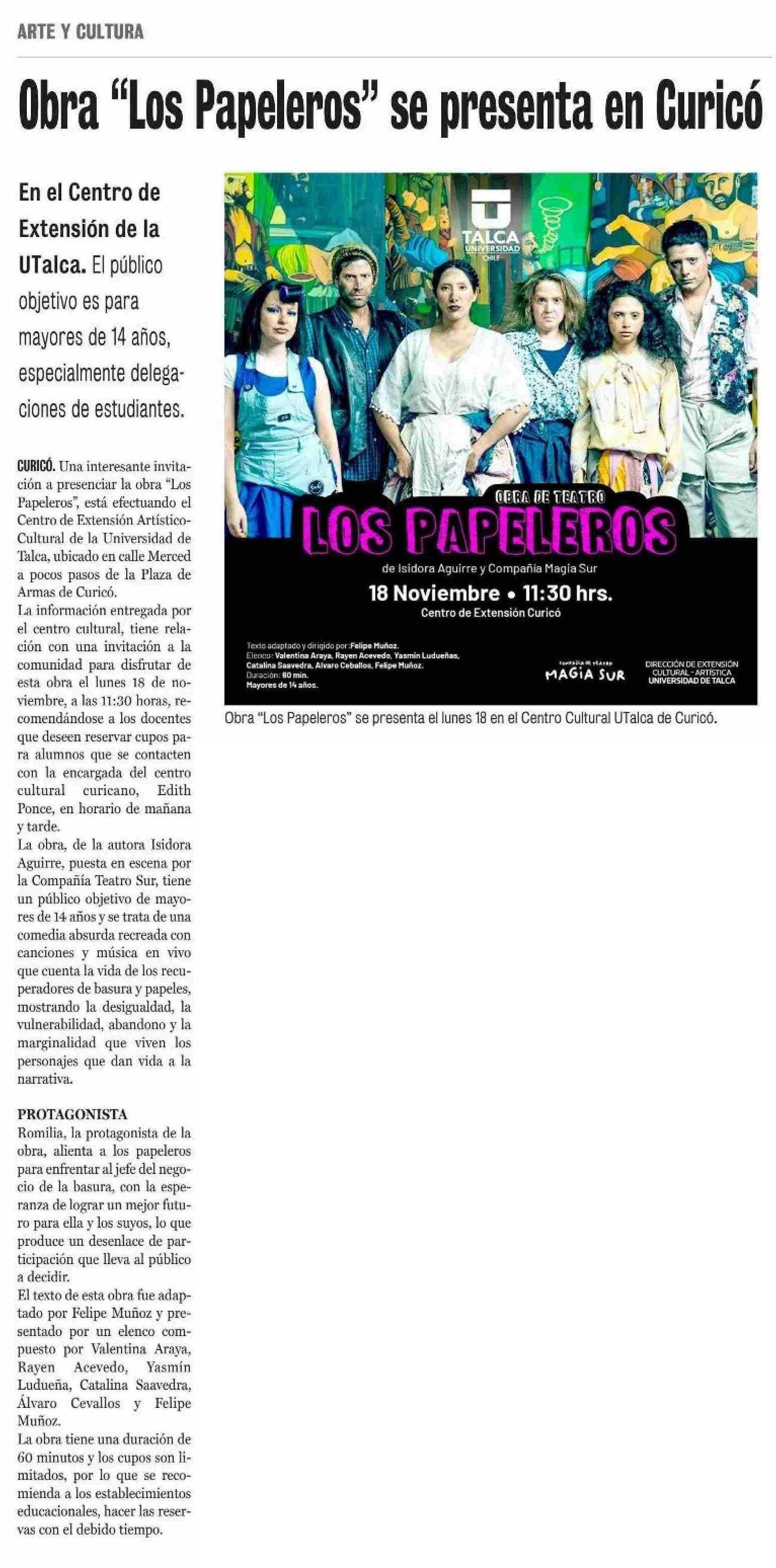 Obra “Los Papeleros” se presenta en Curicó. Se menciona la Universidad de Talca.