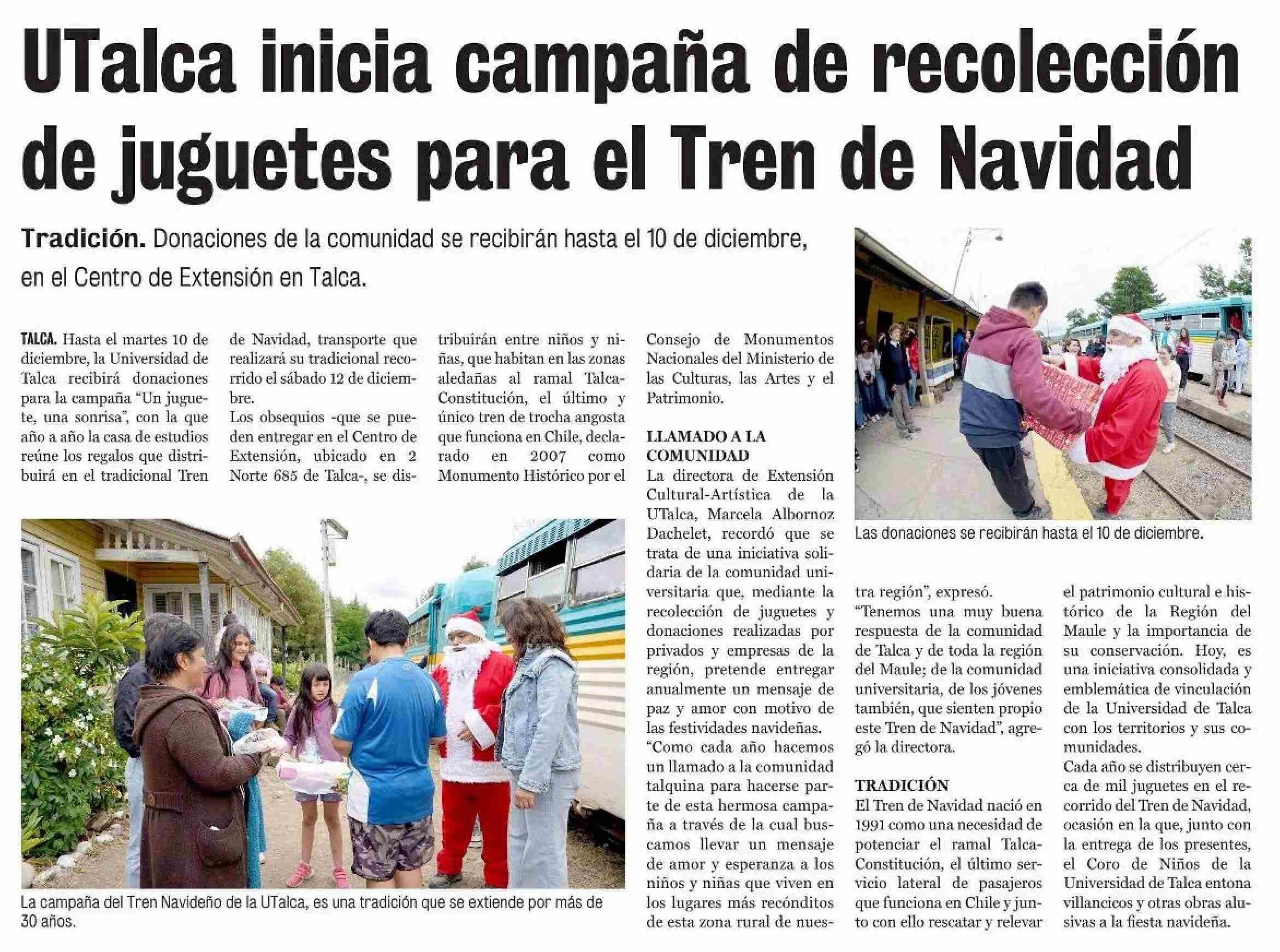 UTalca inicia campaña de recolección de juguetes para el Tren de Navidad. Se refiere Marcela Albornoz Dachelet, directora de Extensión Cultural-Artística.