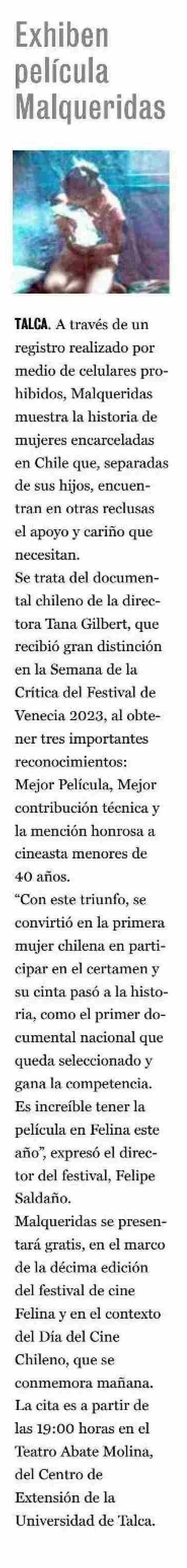 Exhiben películas Malqueridas. Se menciona la Universidad de Talca.