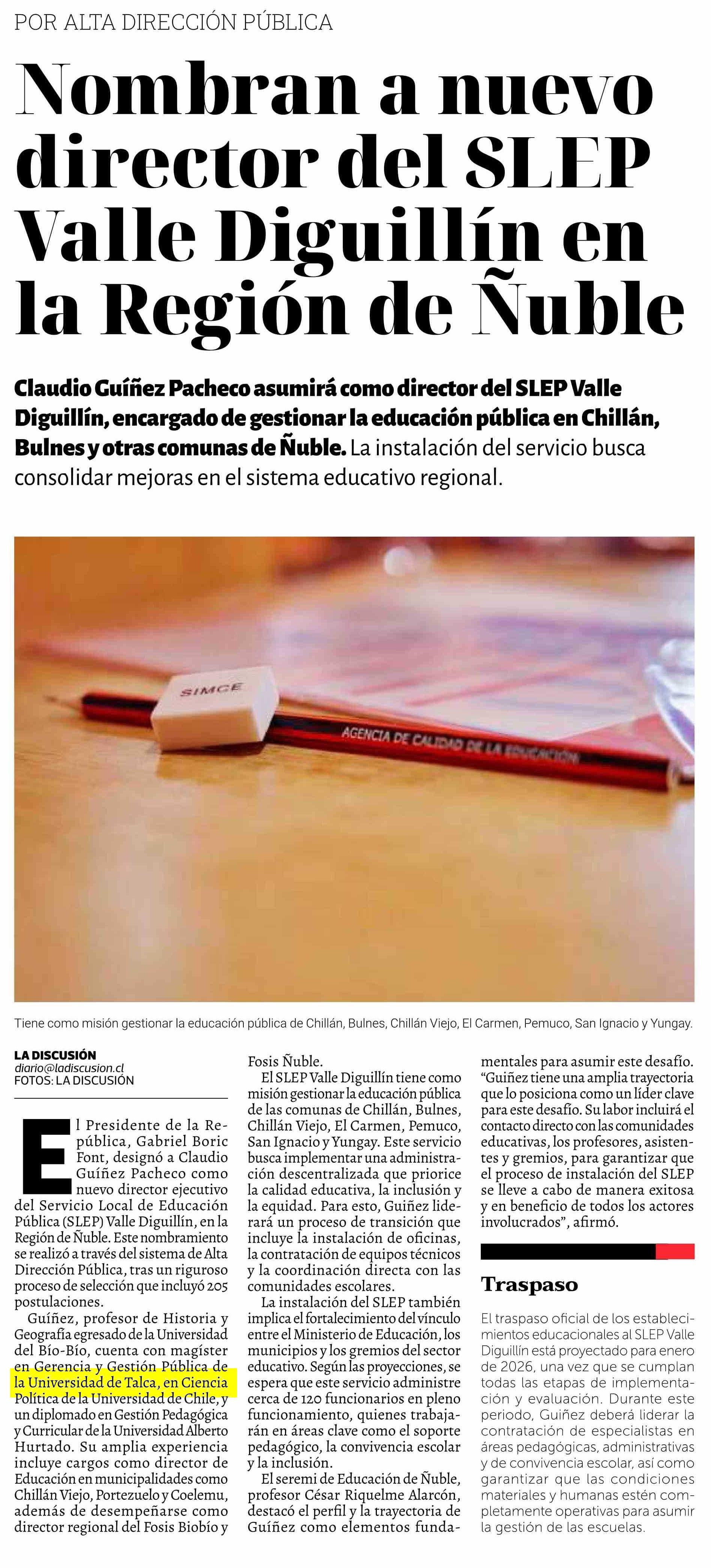 Nombran a nuevo director del SLEP Valle Diguillín en la Región de Ñuble. Se menciona la Universidad de Talca.
