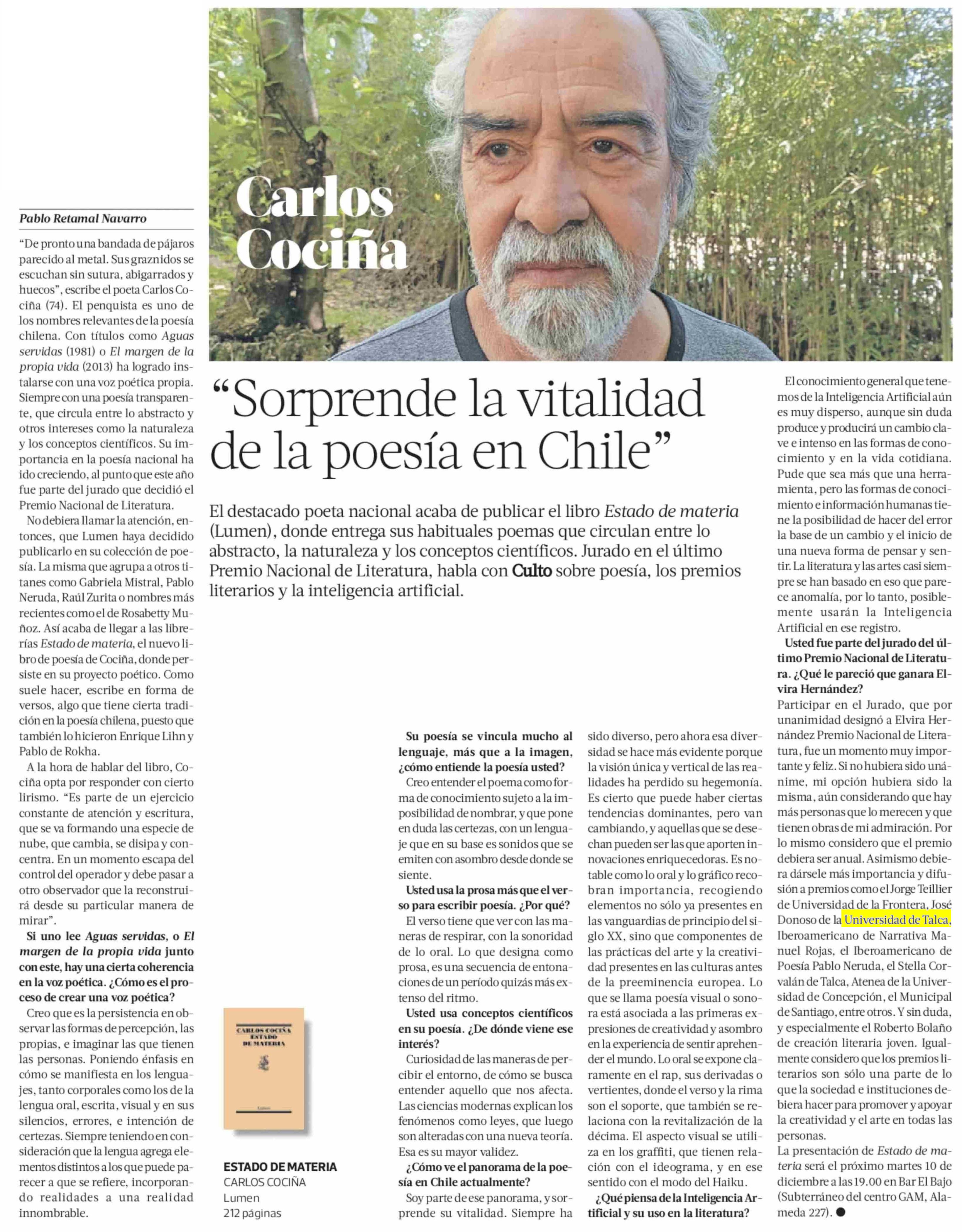 Carlos Cociña “Sorprende la vitalidad de la poesía en Chile”. Se menciona la Universidad de Talca.