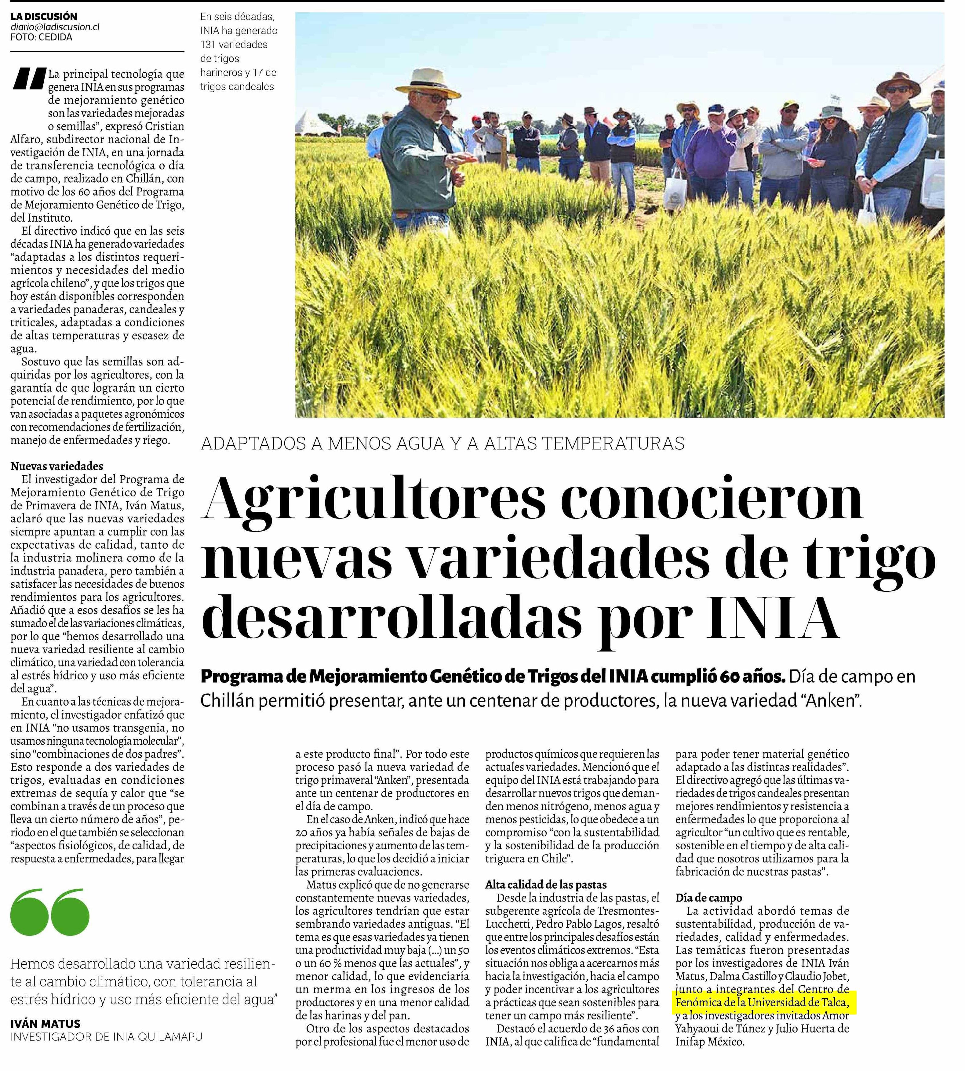 Trigos adaptados a menos agua y a altas temperaturas conocieron productores en actividad de INIA en Chillán. Se menciona la Universidad de Talca.