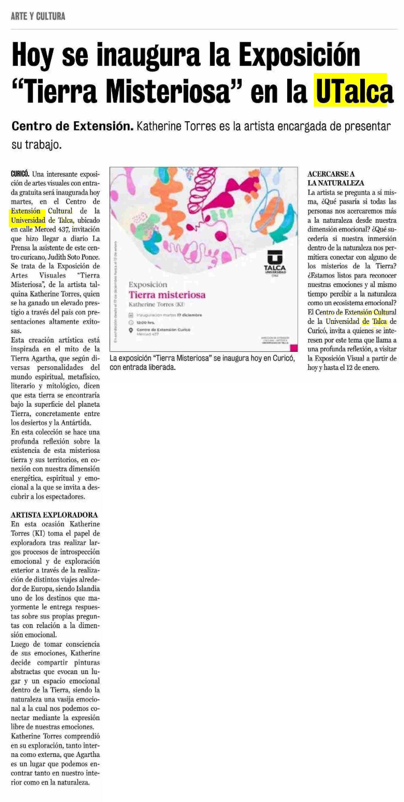 Hoy se inaugura la Exposición “Tierra Misteriosa” en la UTalca. Se menciona la Universidad de Talca.