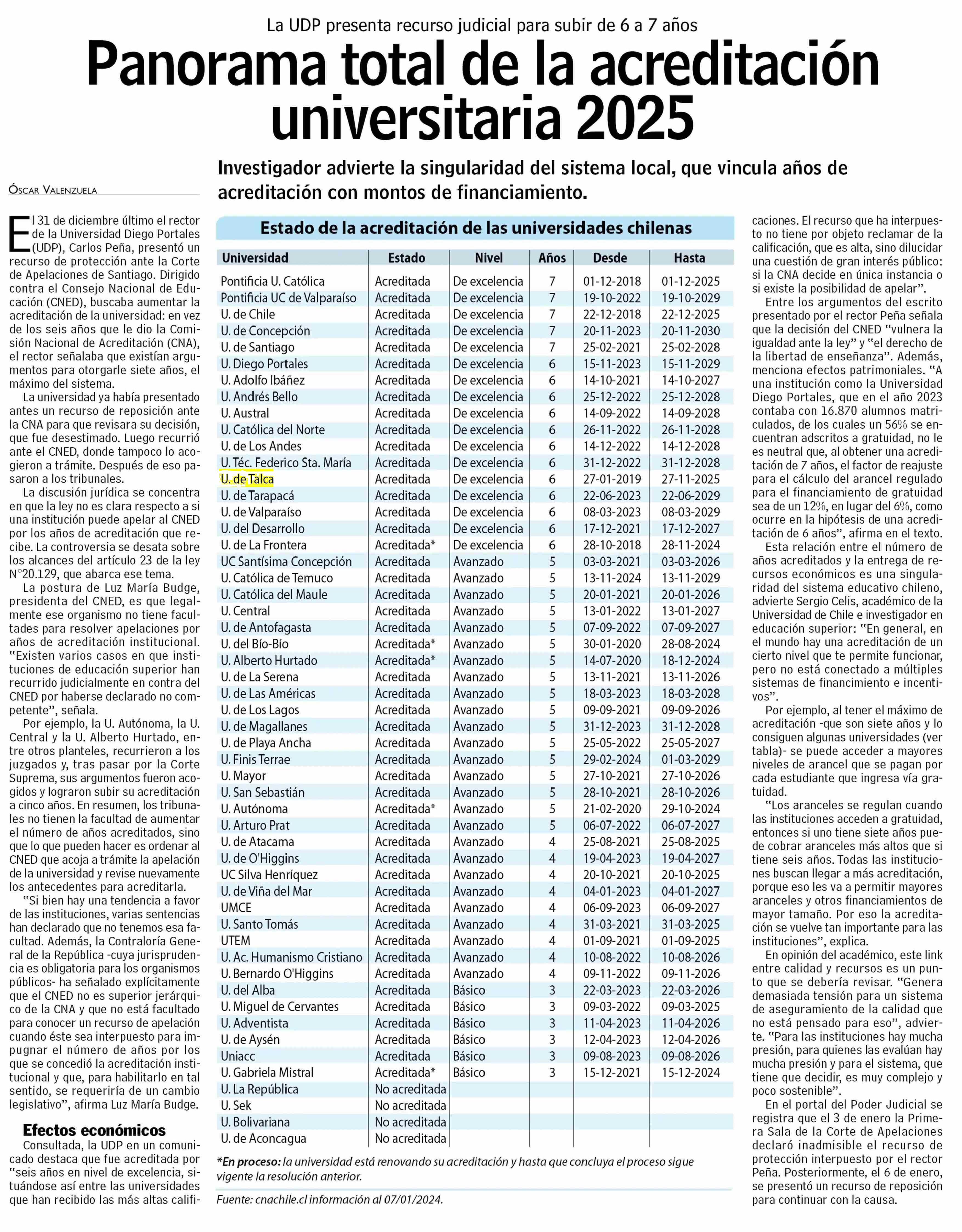 Panorama total de la acreditación universitaria 2025. Se menciona la Universidad de Talca.