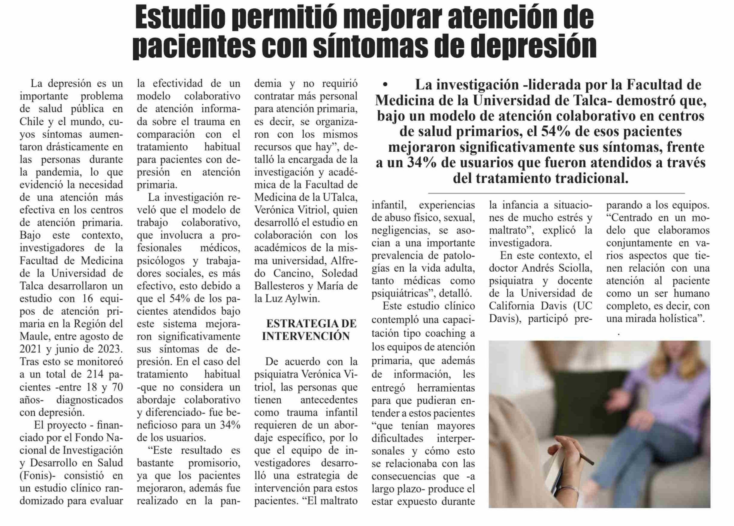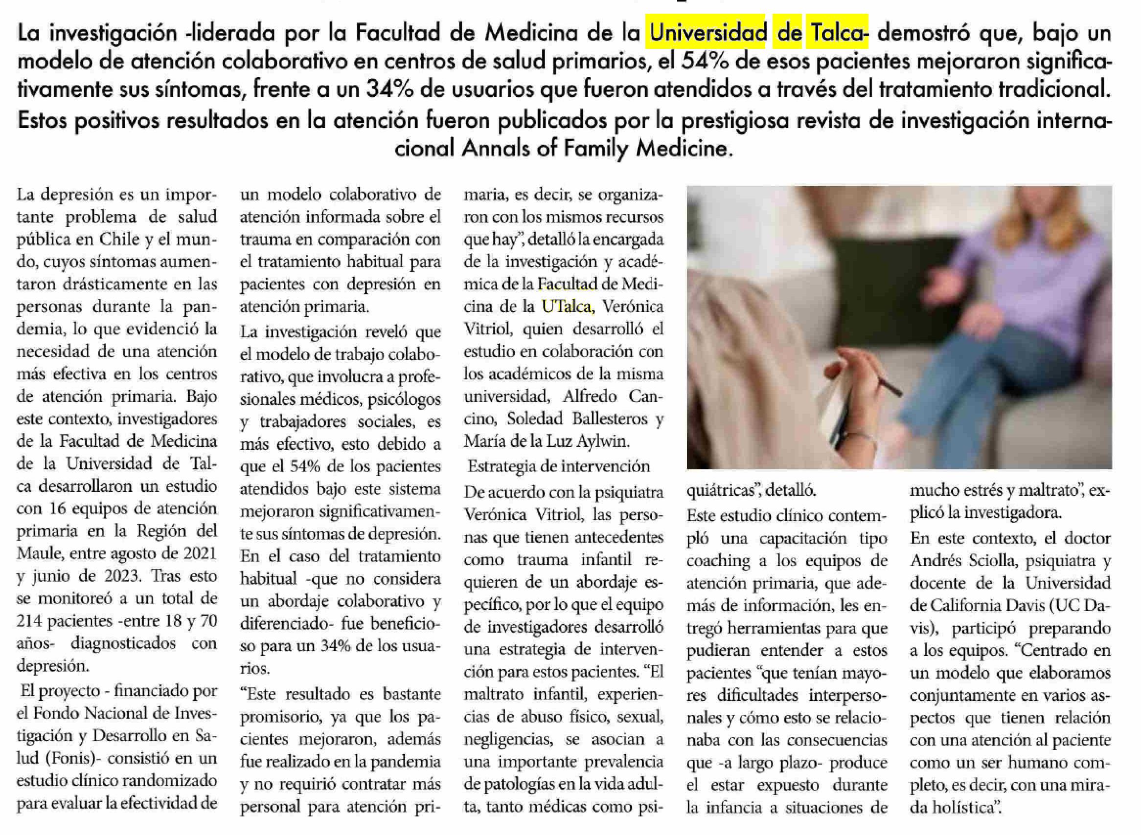 Estudio permitió mejorar atención de pacientes con síntomas de depresión. Se refiere Verónica Vitriol, académica de la Facultad de Medicina.