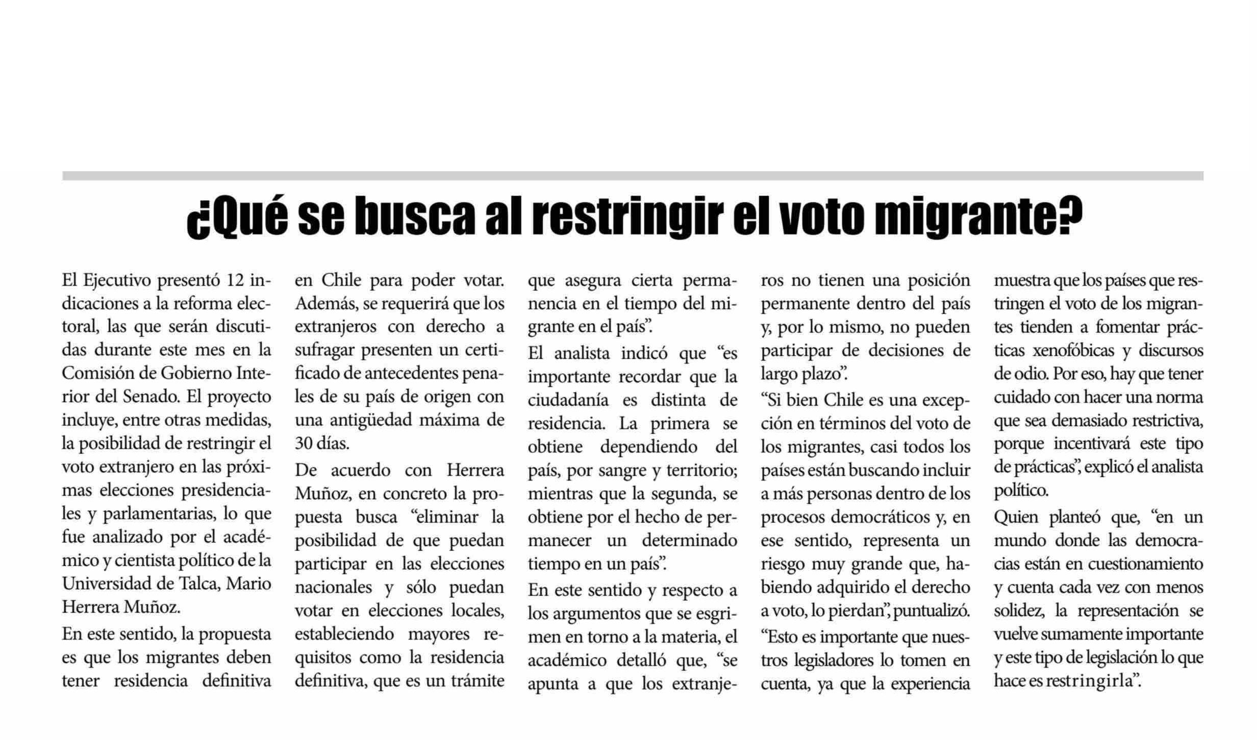 ¿Qué se busca al restringir el voto migrante? Se refiere Mario Herrera Muñoz, académico del Centro de Análisis Político (CAP).