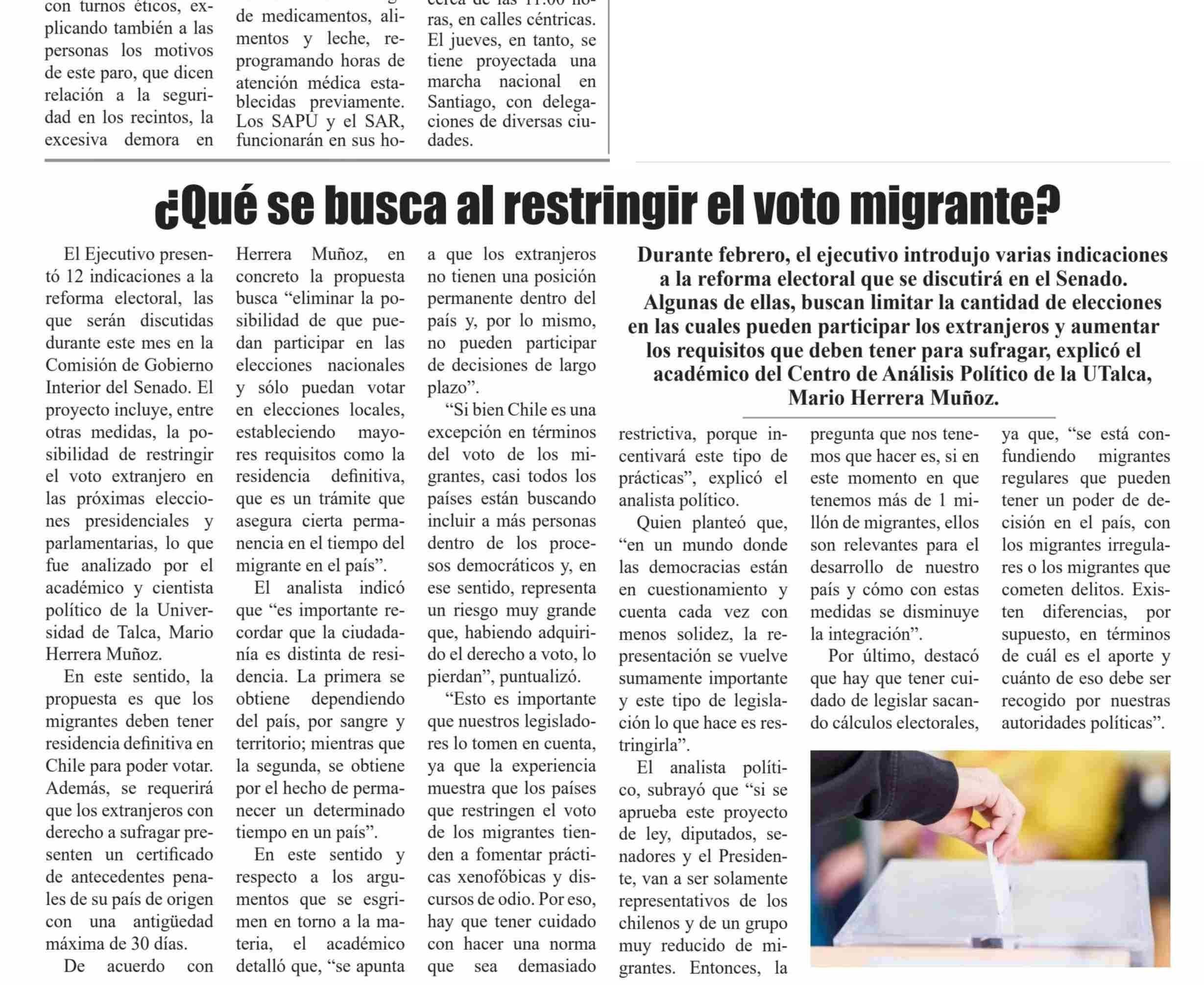 ¿Qué se busca al restringir el voto migrante? Se refiere Mario Herrera Muñoz, académico del Centro de Análisis Político (CAP-UTalca).