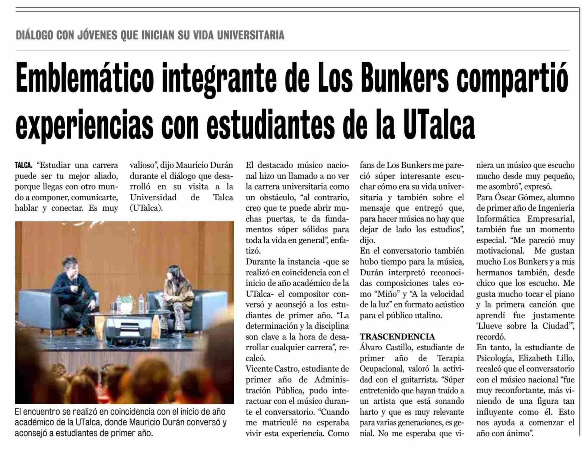 Emblemático integrante de Los Bunkers compartió experiencias con estudiantes de la UTalca. Se menciona la Universidad de Talca.