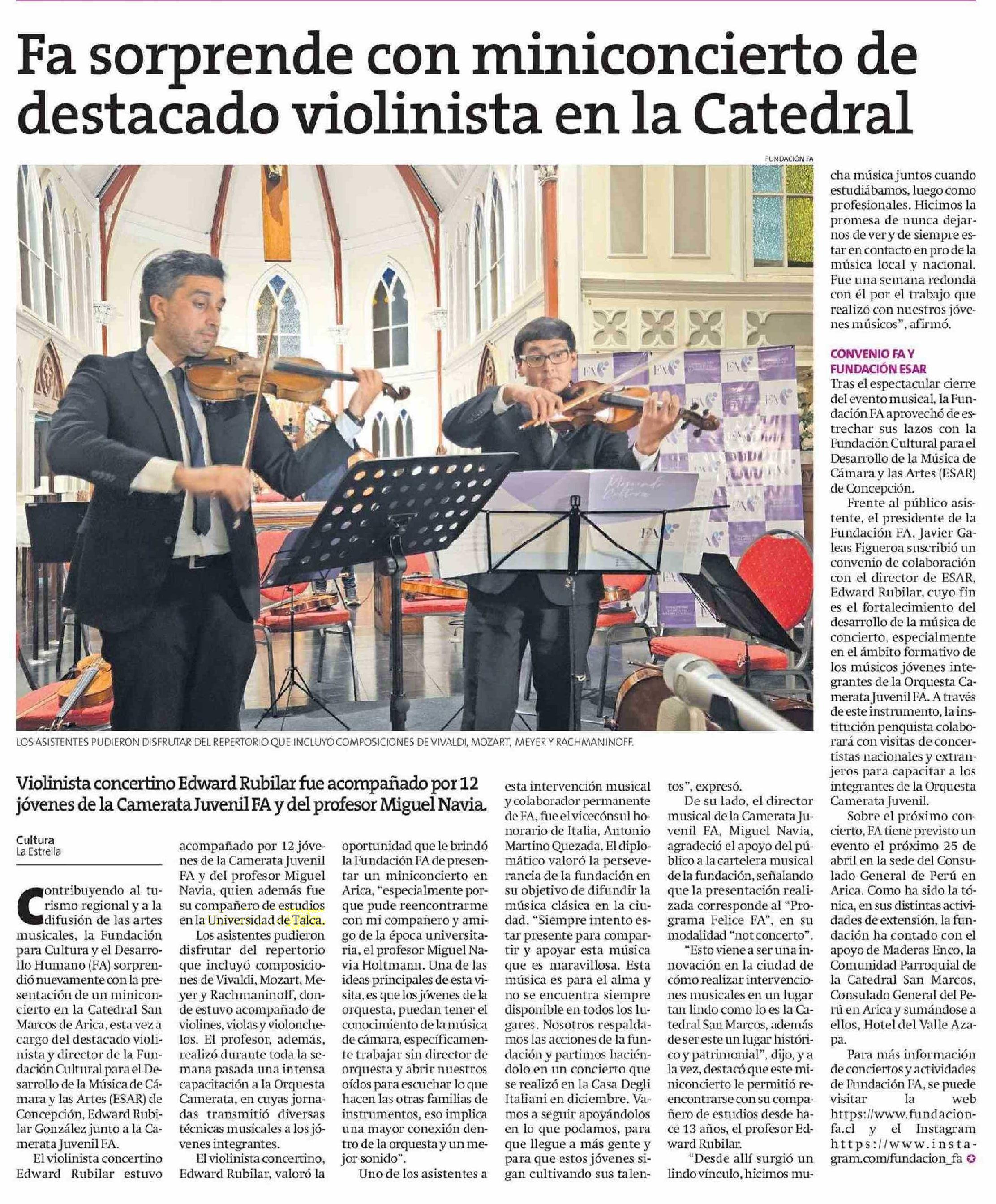Fa sorprende con miniconcierto de destacado violinista en la Catedral. Se menciona la Universidad de Talca.