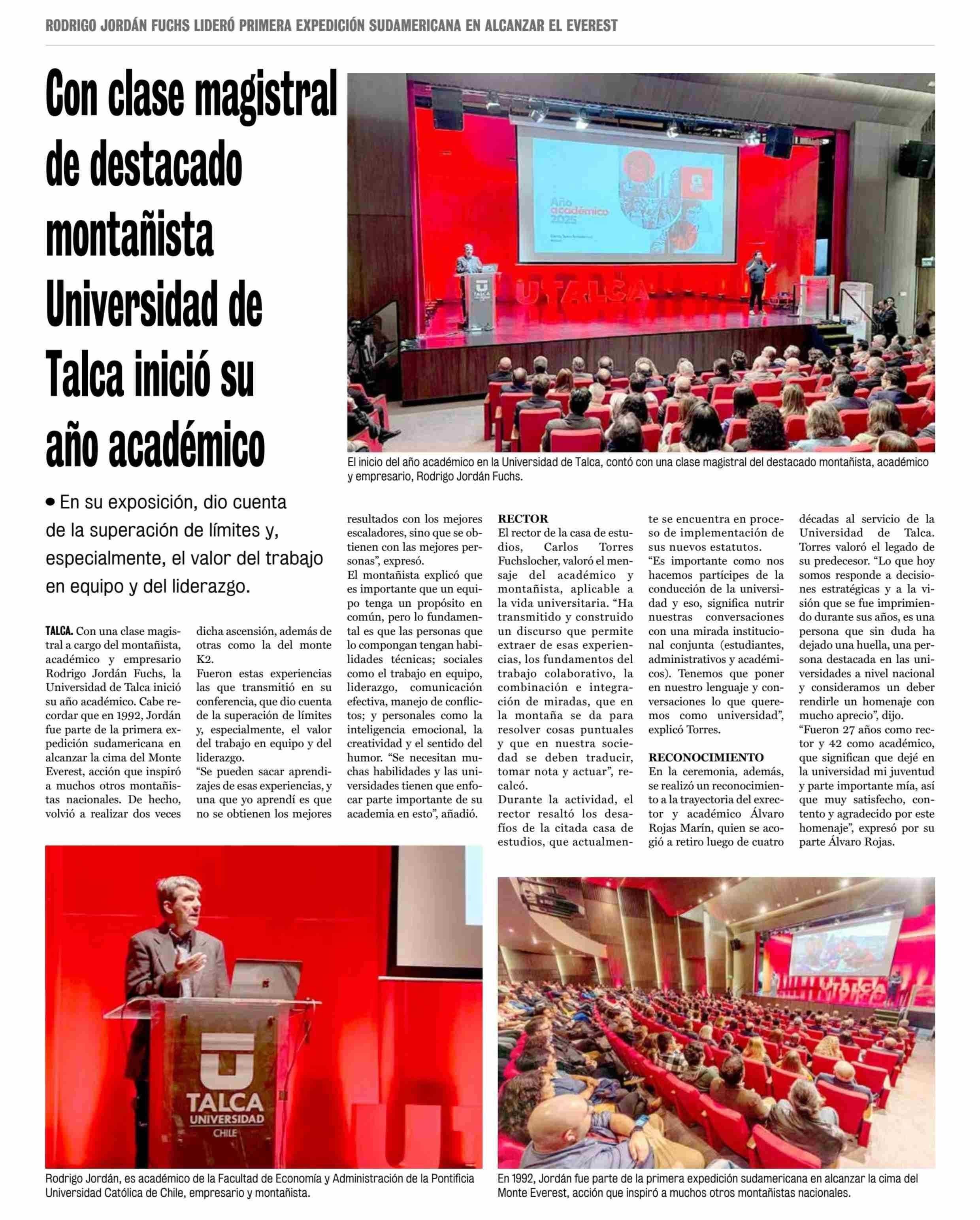 Con clase magistral de destacado montañista Universidad de Talca inició su año académico. Se refiere Carlos Torres Fuchslosher, rector.