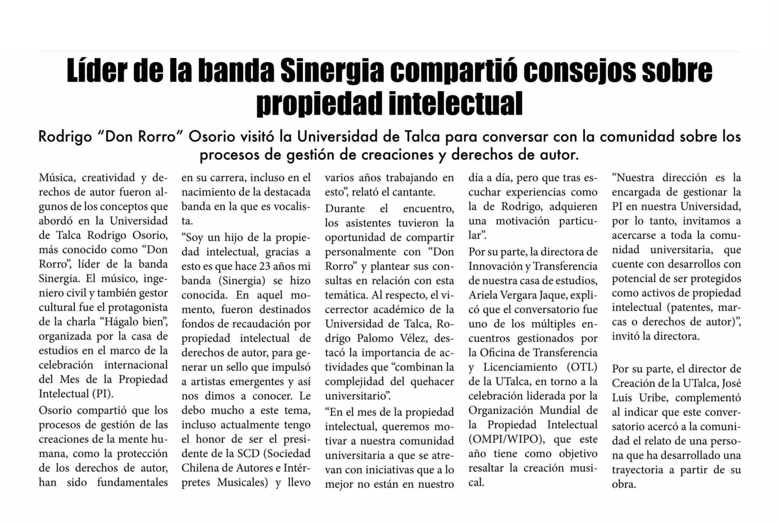 Don Rorro, líder de Sinergia y presidente de la SCD, impartió charla sobre propiedad intelectual en la UTalca. Se refiere Rodrigo Palomo Vélez, vicerrector académico, Ariela Vergara Jaque, directora de Innovación y Transferencia y José Luis Uribe, director de Creación.