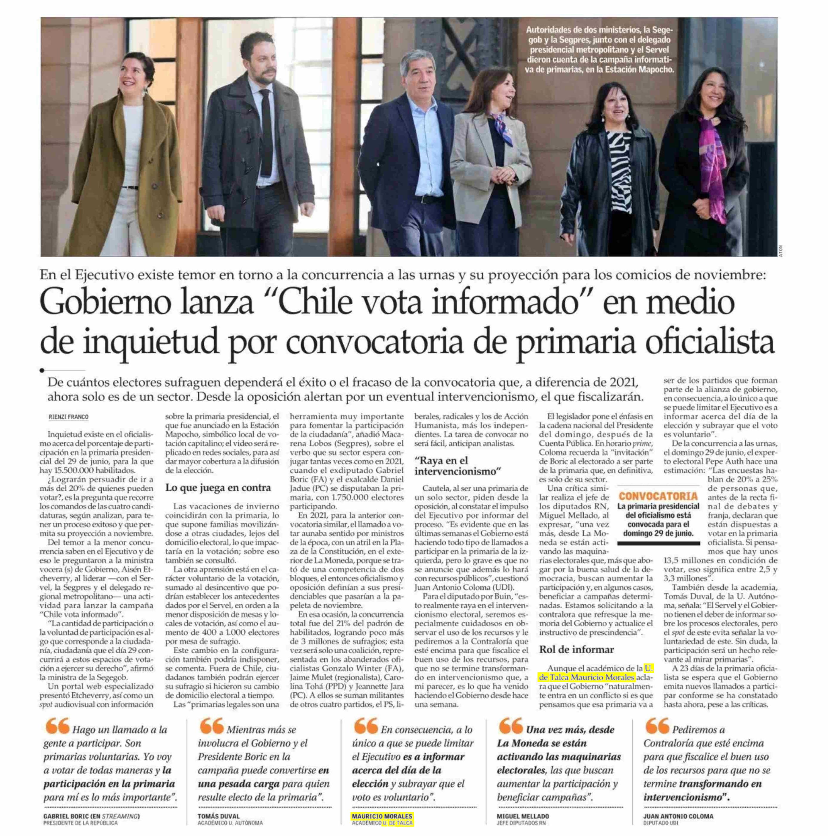 Gobierno lanza “Chile vota informado” en medio de inquietud por convocatoria de primaria oficialista. Se refiere Mauricio Morales Quiroga, director del Centro de Análisis Político (CAP-UTalca).