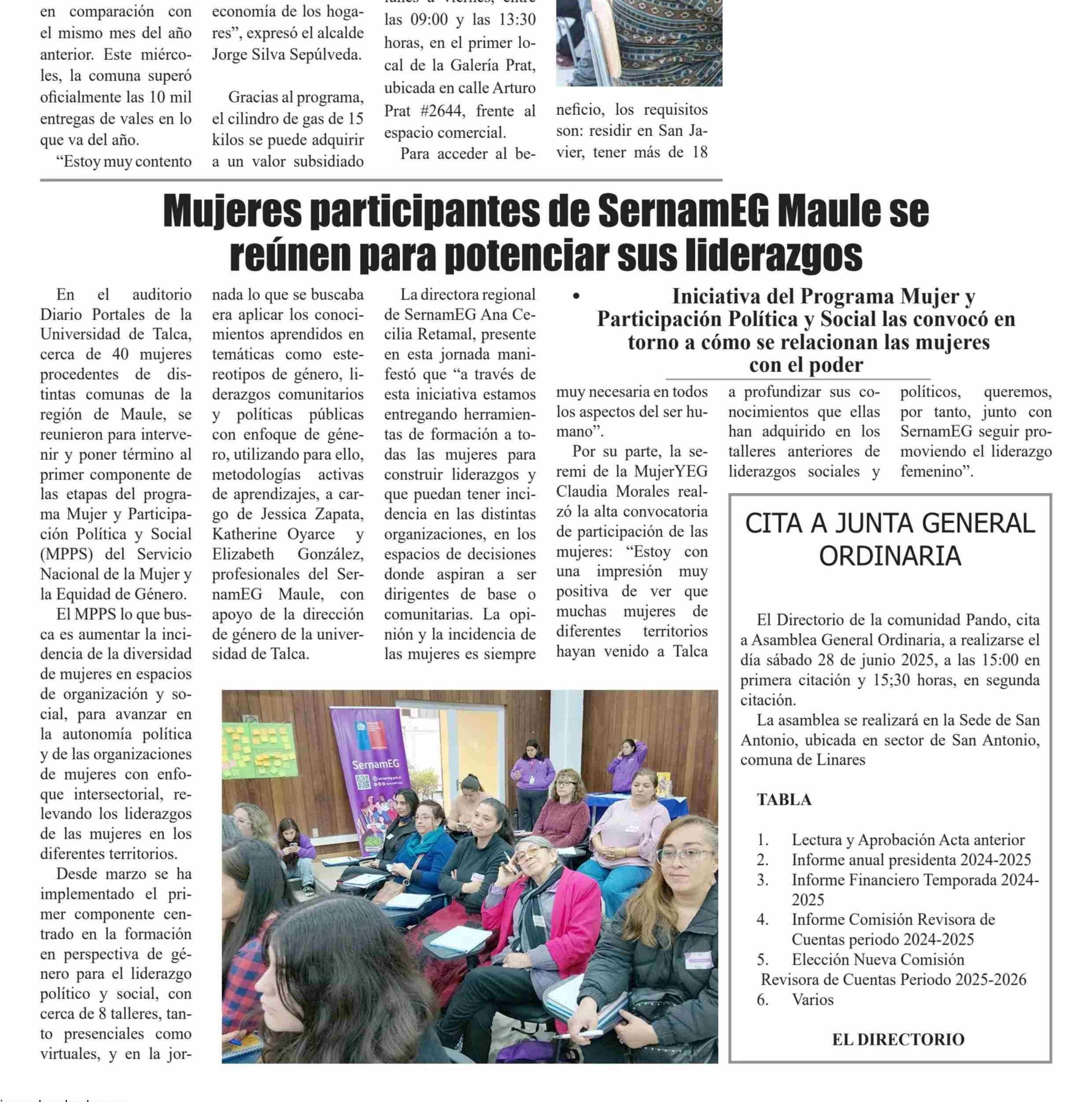 Mujeres participantes de SernamEG Maule se reúnen para potenciar sus liderazgos. Se menciona la Universidad de Talca.