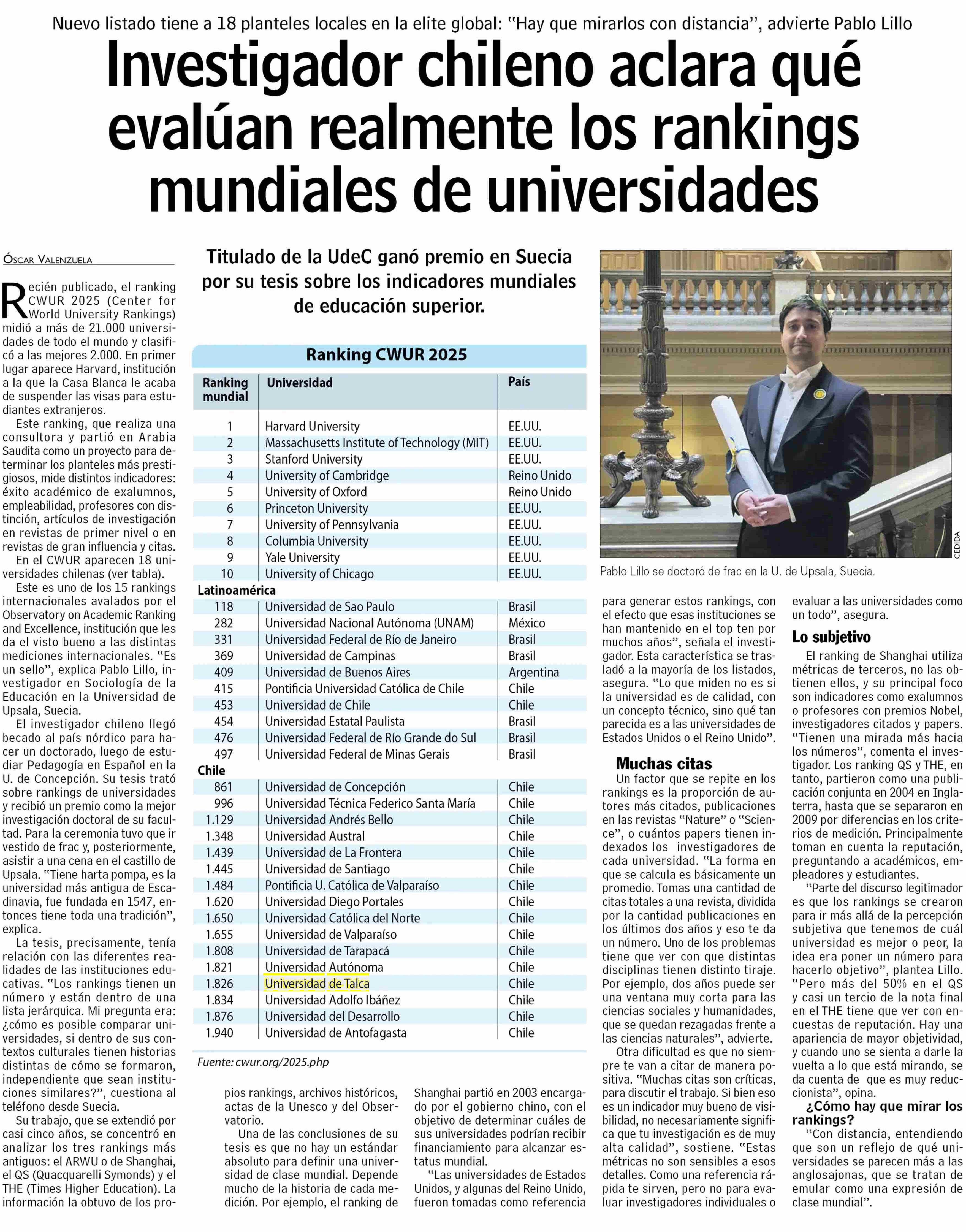 Investigador chileno aclara qué evalúan realmente los rankings mundiales de universidades. Se menciona la Universidad de Talca.