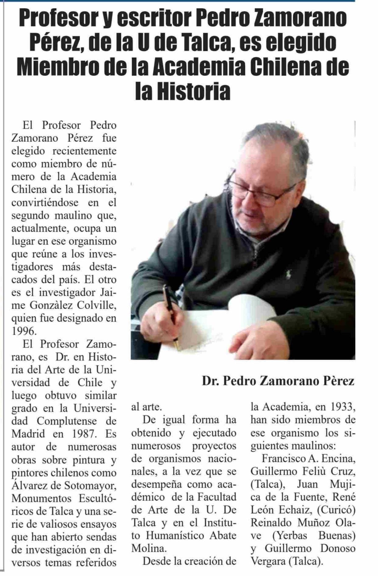 Profesor y escritor Pedro Zamorano Pérez, de la U de Talca, es elegido Miembro de la Academia Chilena de la Historia. Se menciona la Universidad de Talca.
