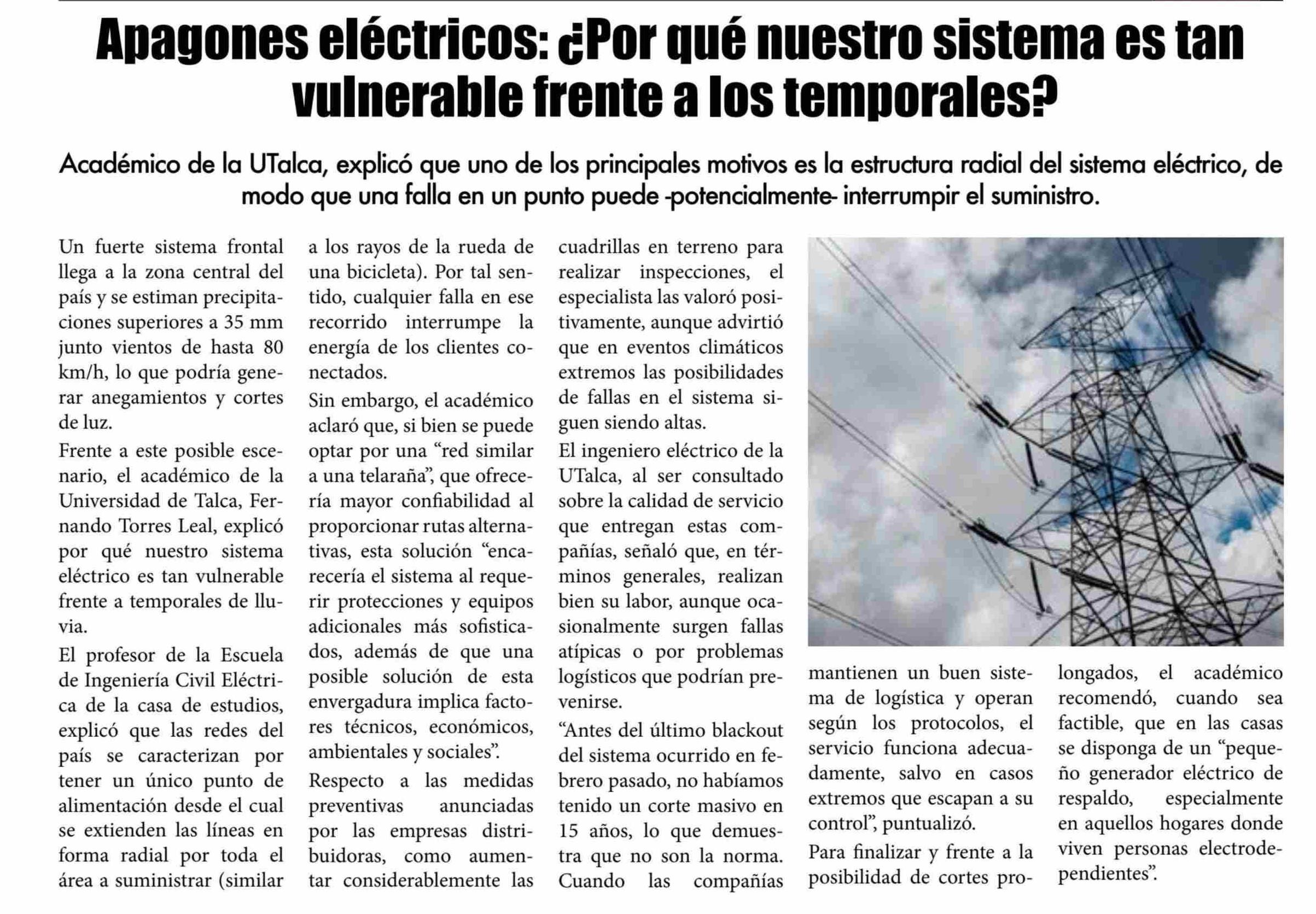 Apagones eléctricos: ¿Por qué nuestro sistema es tan vulnerable frente a los temporales» Se refiere Fernando Torres Leal, académico de la Facultad de Ingeniería.