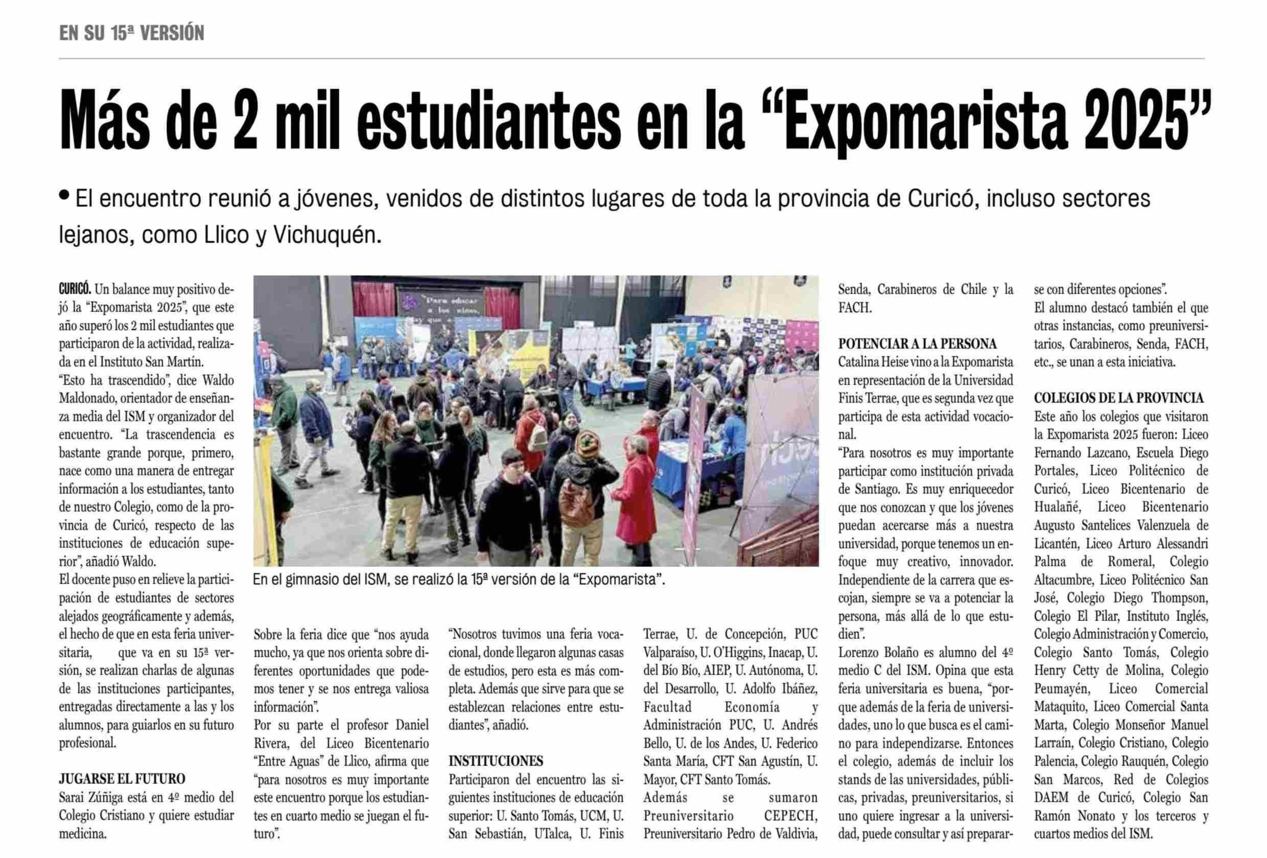 Más de 2 mil estudiantes en la “Expomarista 2025”. Se menciona la Universidad de Talca.