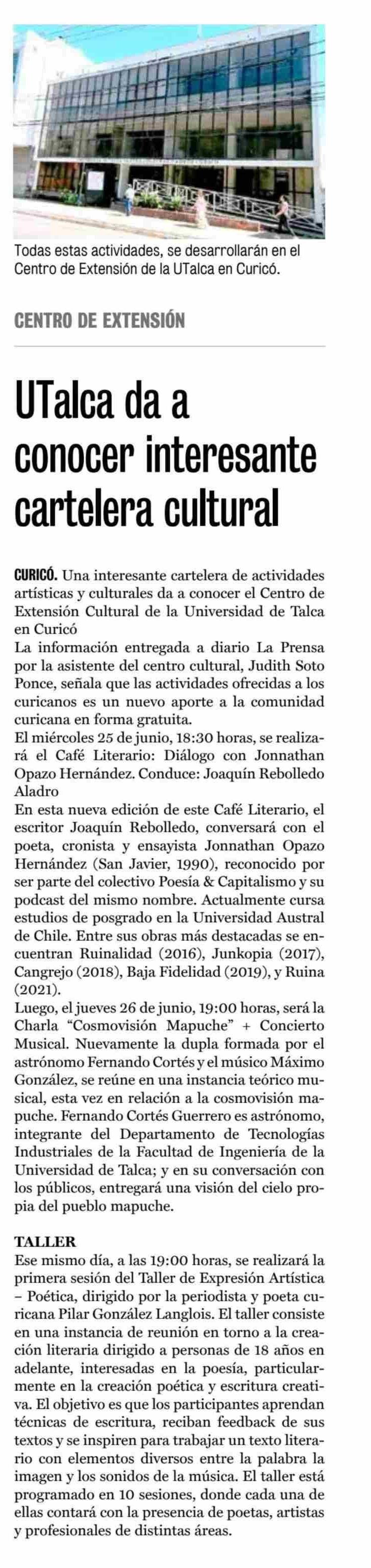 UTalca da a conocer interesante cartelera cultural. Se menciona la Universidad de Talca.
