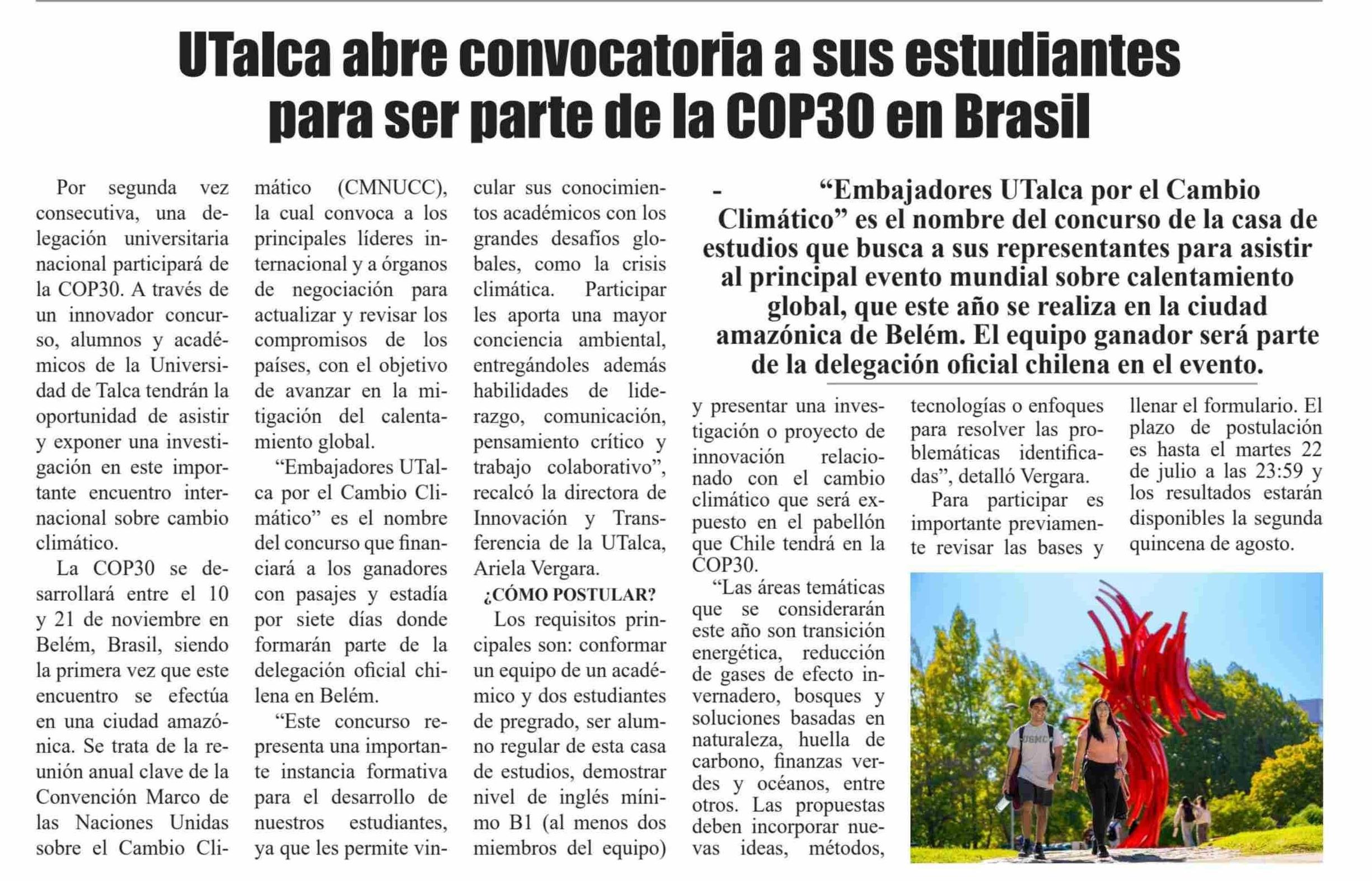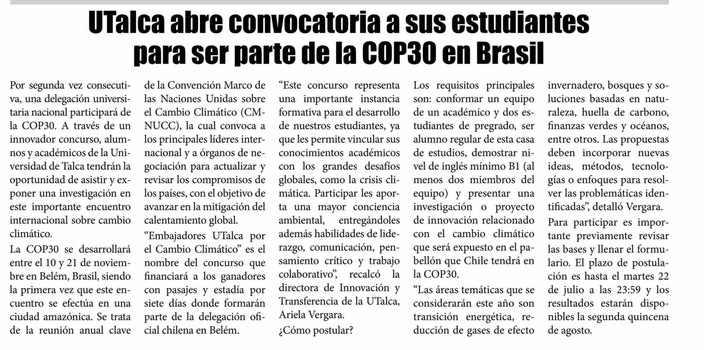 UTalca abre convocatoria a sus estudiantes para ser parte de la COP30 en Brasil. Se refiere Ariela Vergara, directora de Innovación y Transferencia.
