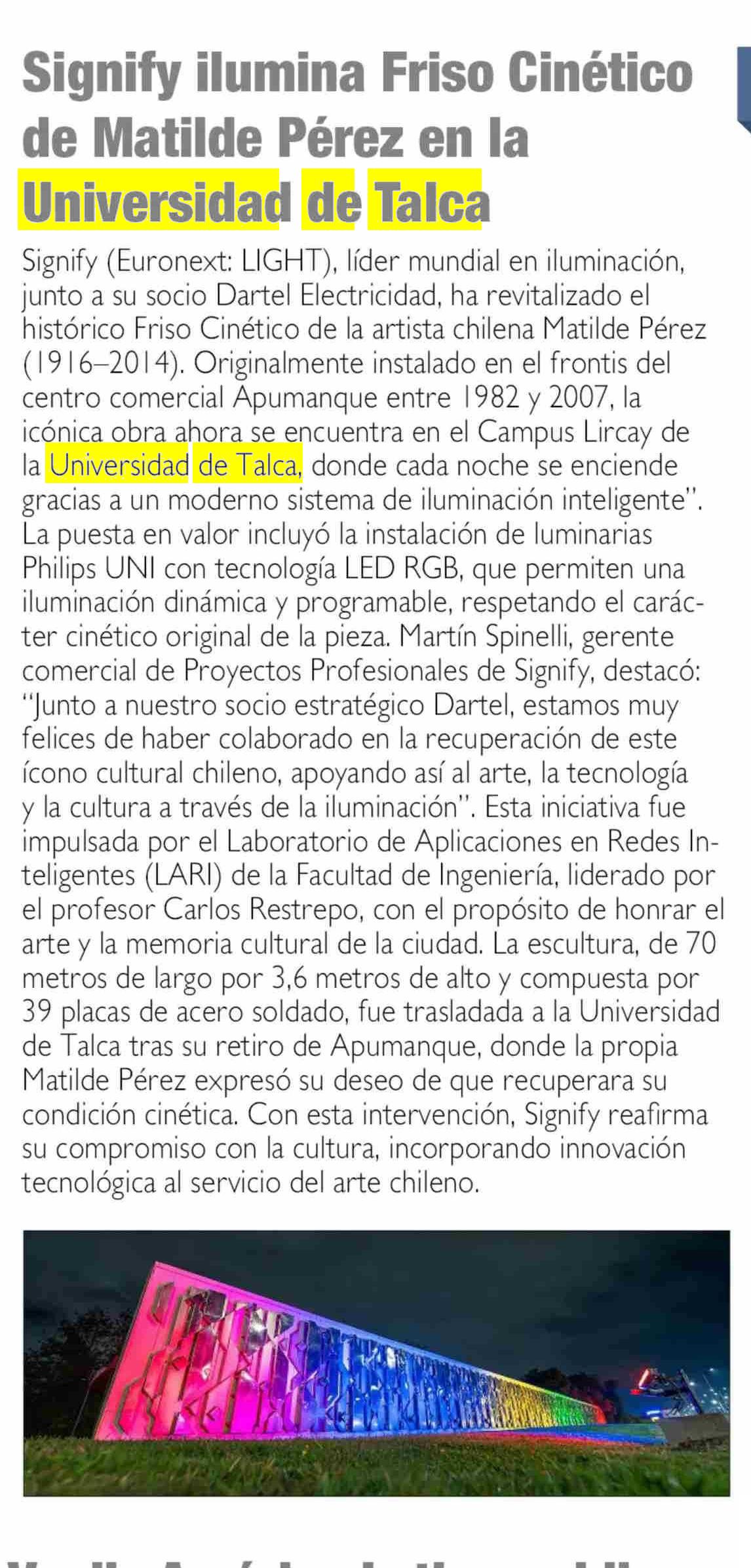 Signify ilumina Friso Cinético de Matilde Pérez en la Universidad de Talca. Se menciona la Universidad de Talca.