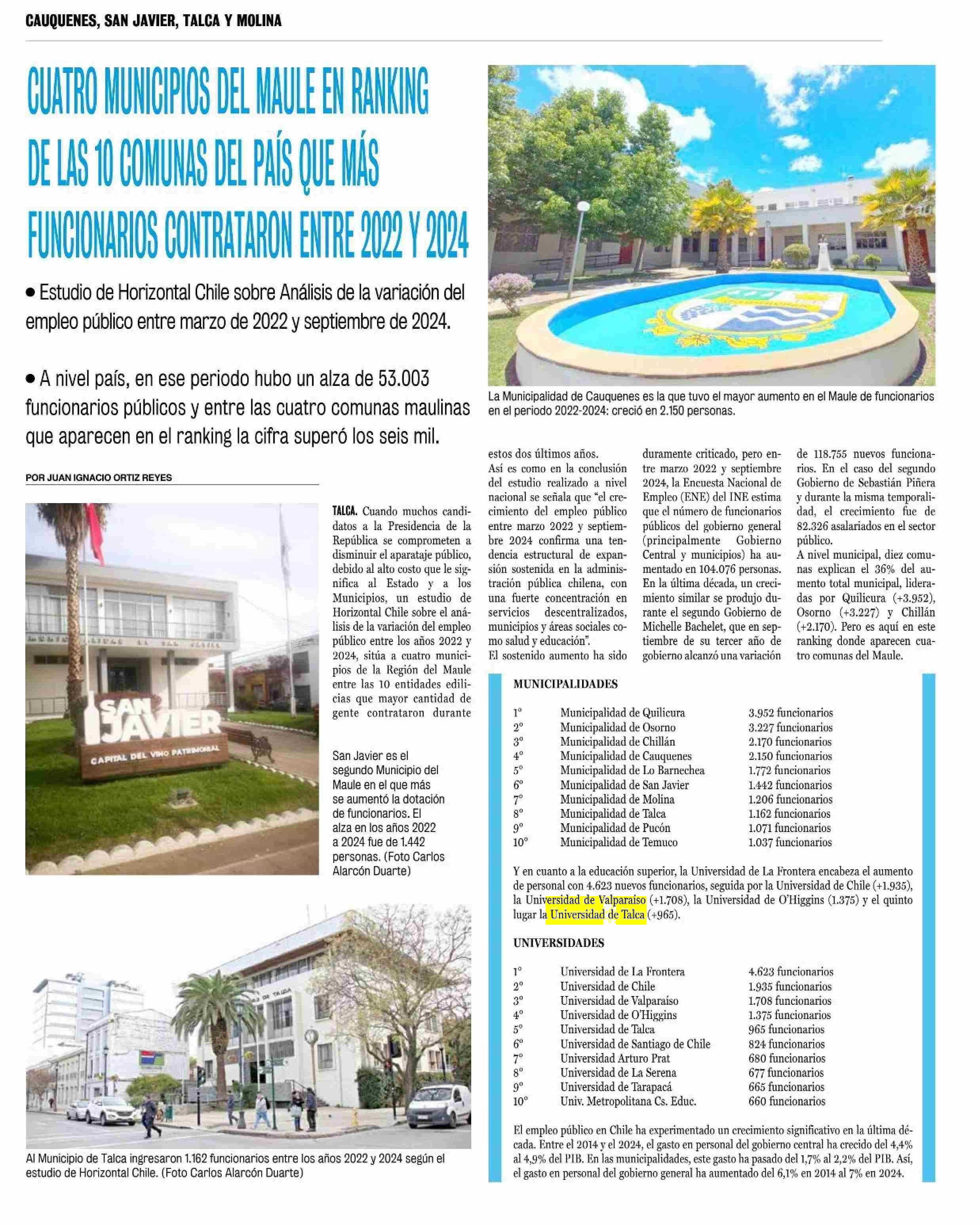 Cuatro municipios del maule en ranking de las 10 comunas del país que más funcionarios contrataron entre 2022 y 2024.