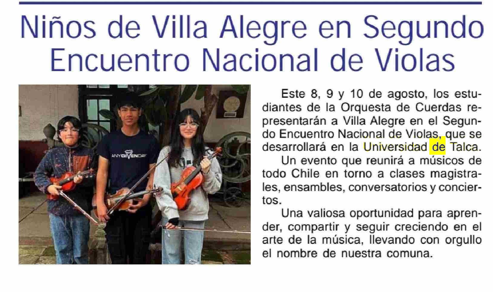 Niños de Villa Alegre en Segundo Encuentro Nacional de Violas. Se menciona la Universidad de Talca.