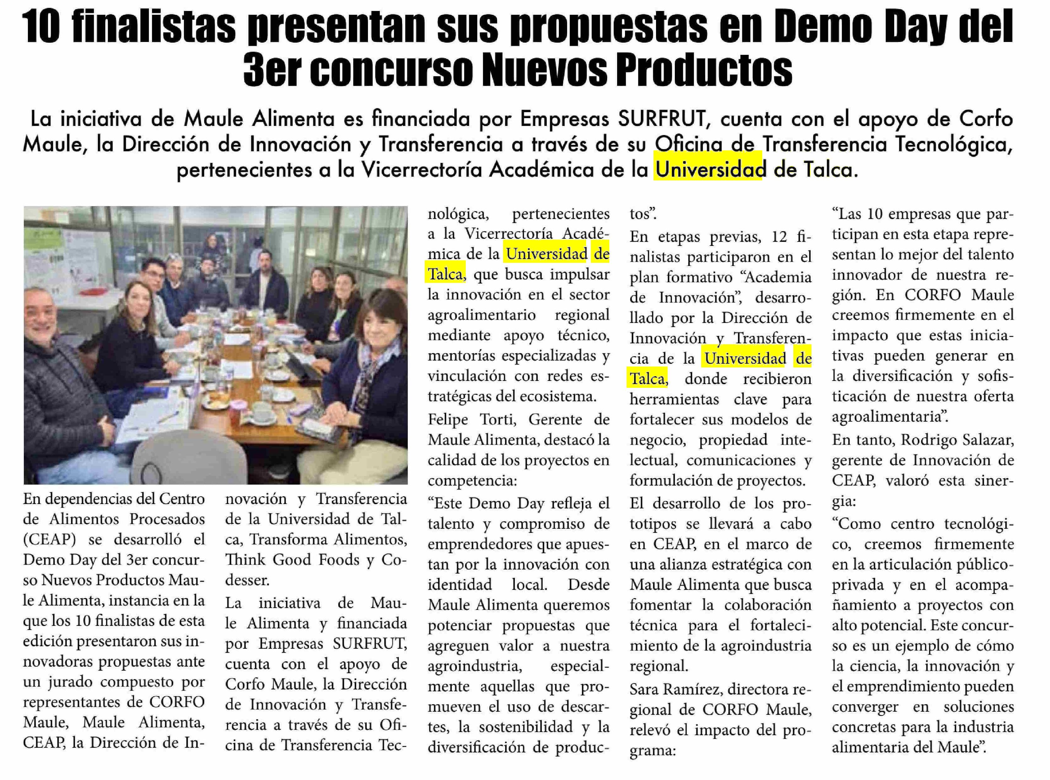 10 finalistas presentan sus propuestas en Demo Day del 3er concurso Nuevos Productos Maule Alimenta. Se menciona la Universidad de Talca.