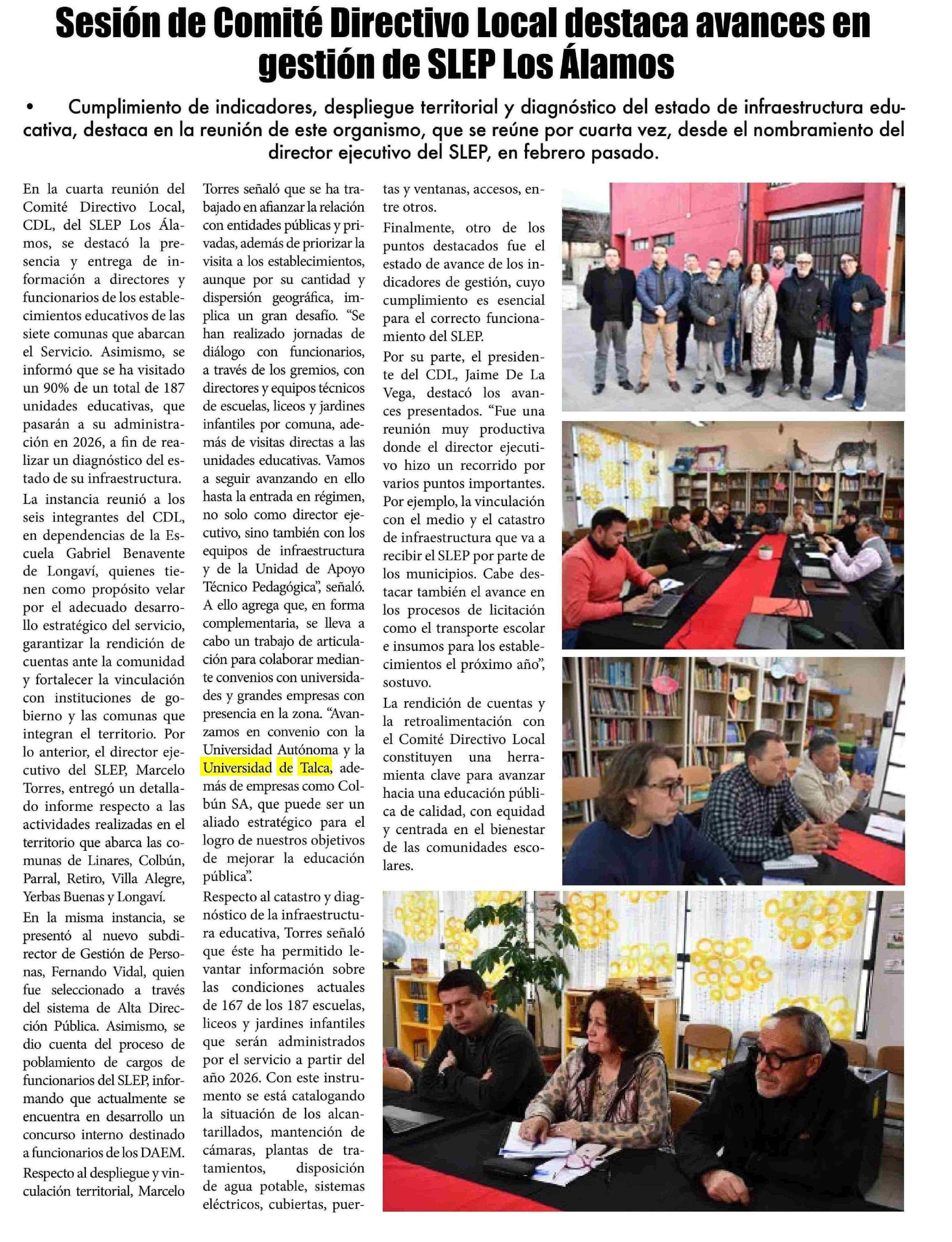 Sesión de Comité Directivo Local destaca avances en gestión de SLEP Los Álamos 8 agosto 2025. Se menciona la Universidad de Talca.
