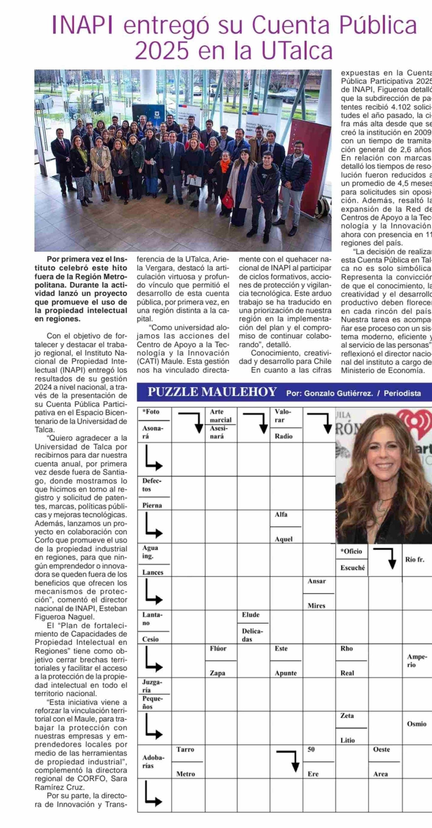 INAPI entregó su cuenta pública 2025 en la UTalca. Se refiere Ariela Vergara, la directora de Innovación y Transferencia de la UTalca.