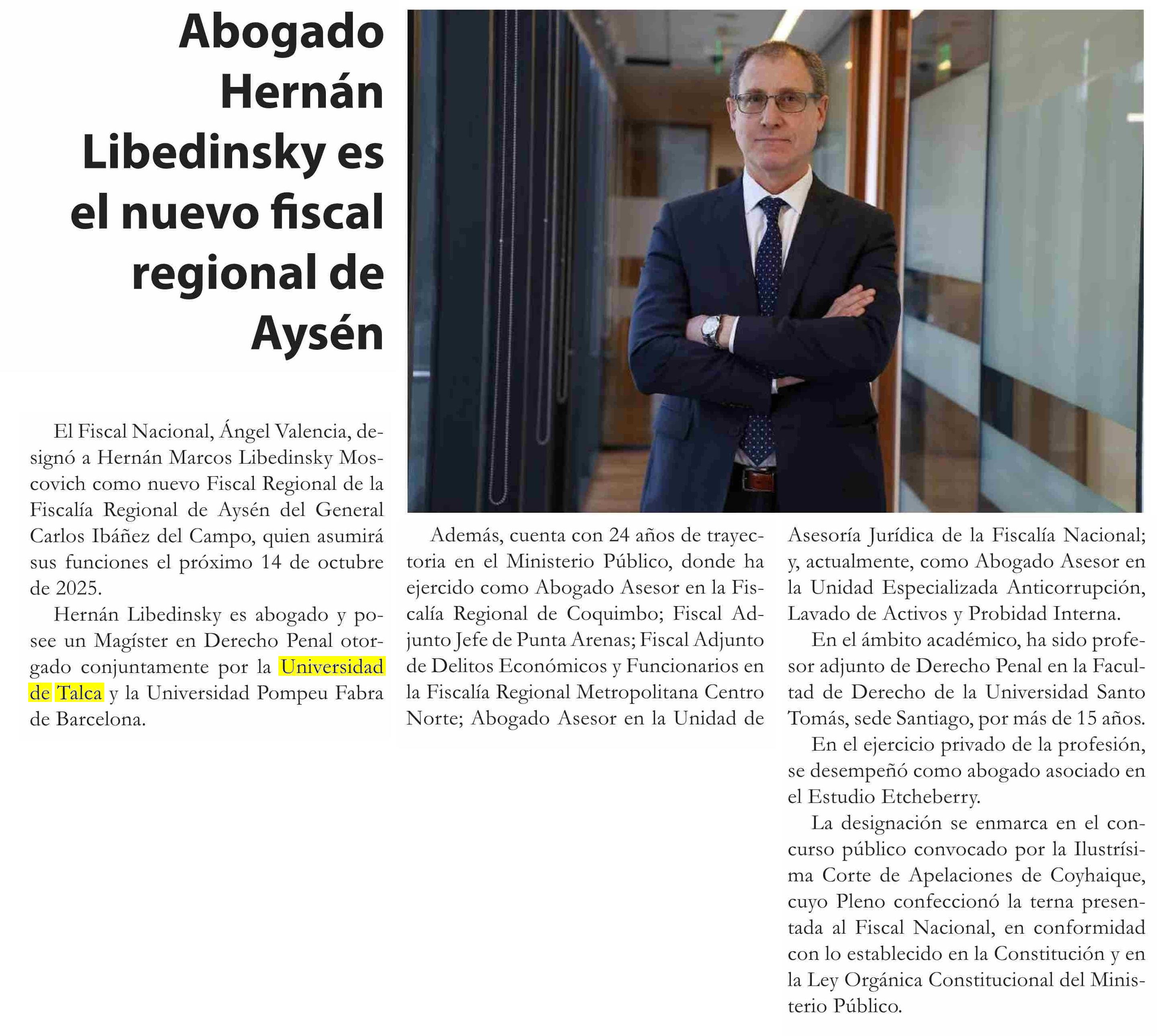 Abogado Hernán Libedinsky es el nuevo fiscal regional de Aysén. Se menciona la Universidad de Talca.