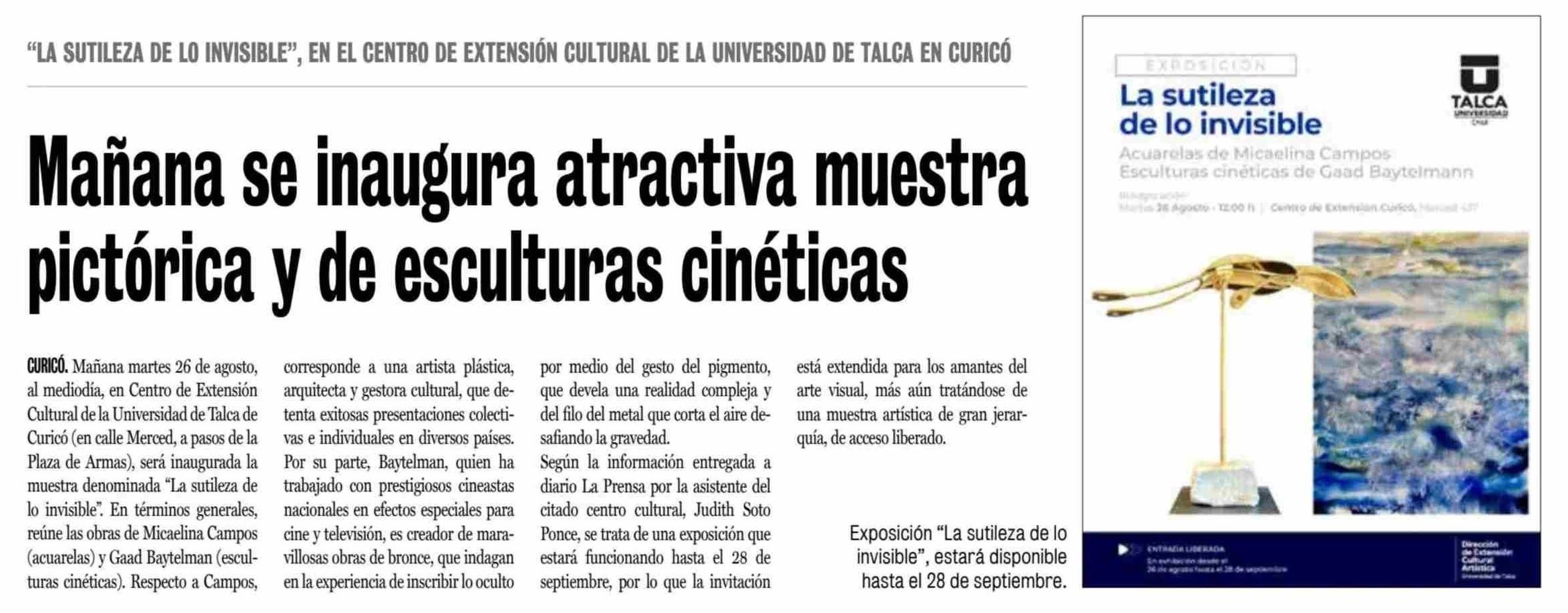 Mañana se inaugura atractiva muestra pictórica y de esculturas cinéticas. Se menciona la Universidad de Talca.