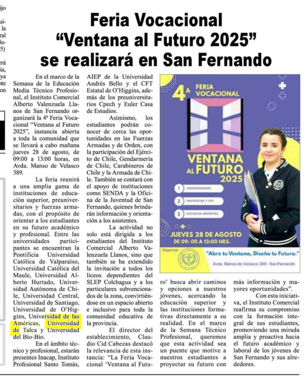 Feria Vocacional “Ventana al Futuro 2025” se realizará en San Fernando. Se menciona la Universidad de Talca.