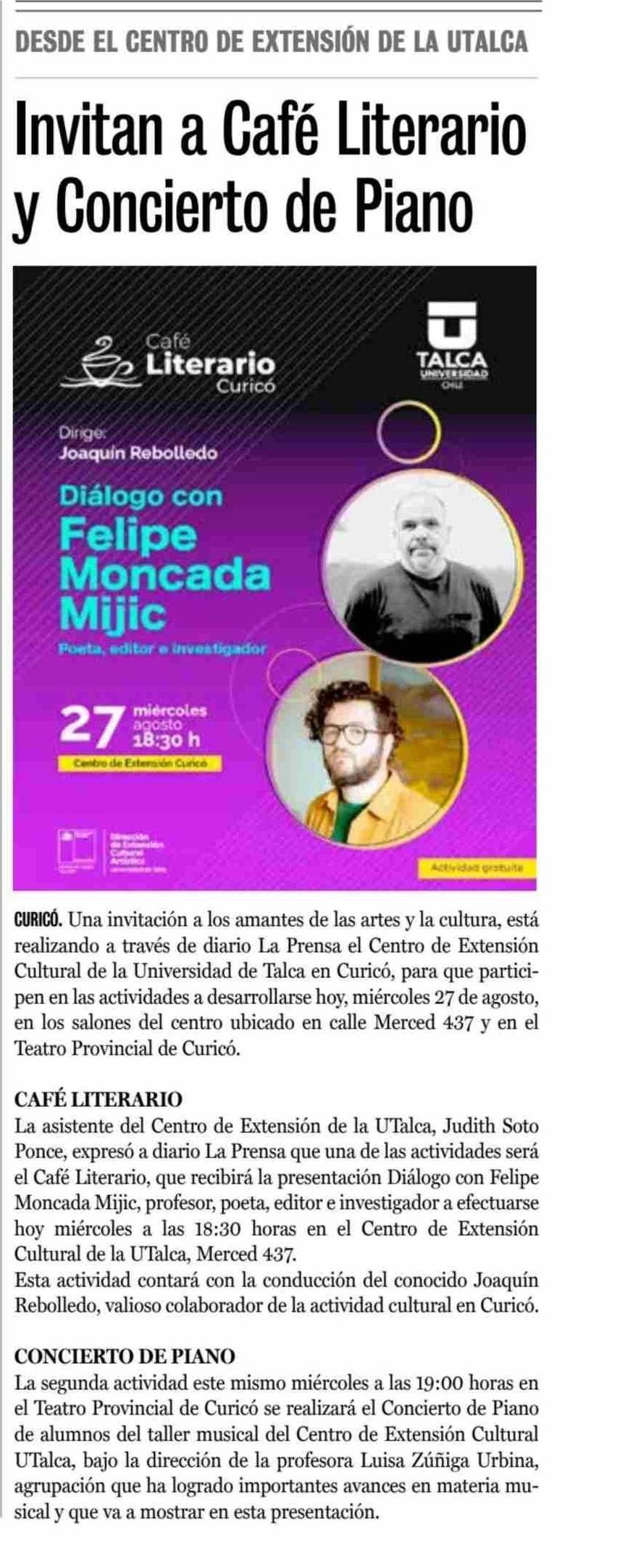 Invitan a Café Literario y Concierto de Piano. Se menciona la Universidad de Talca.