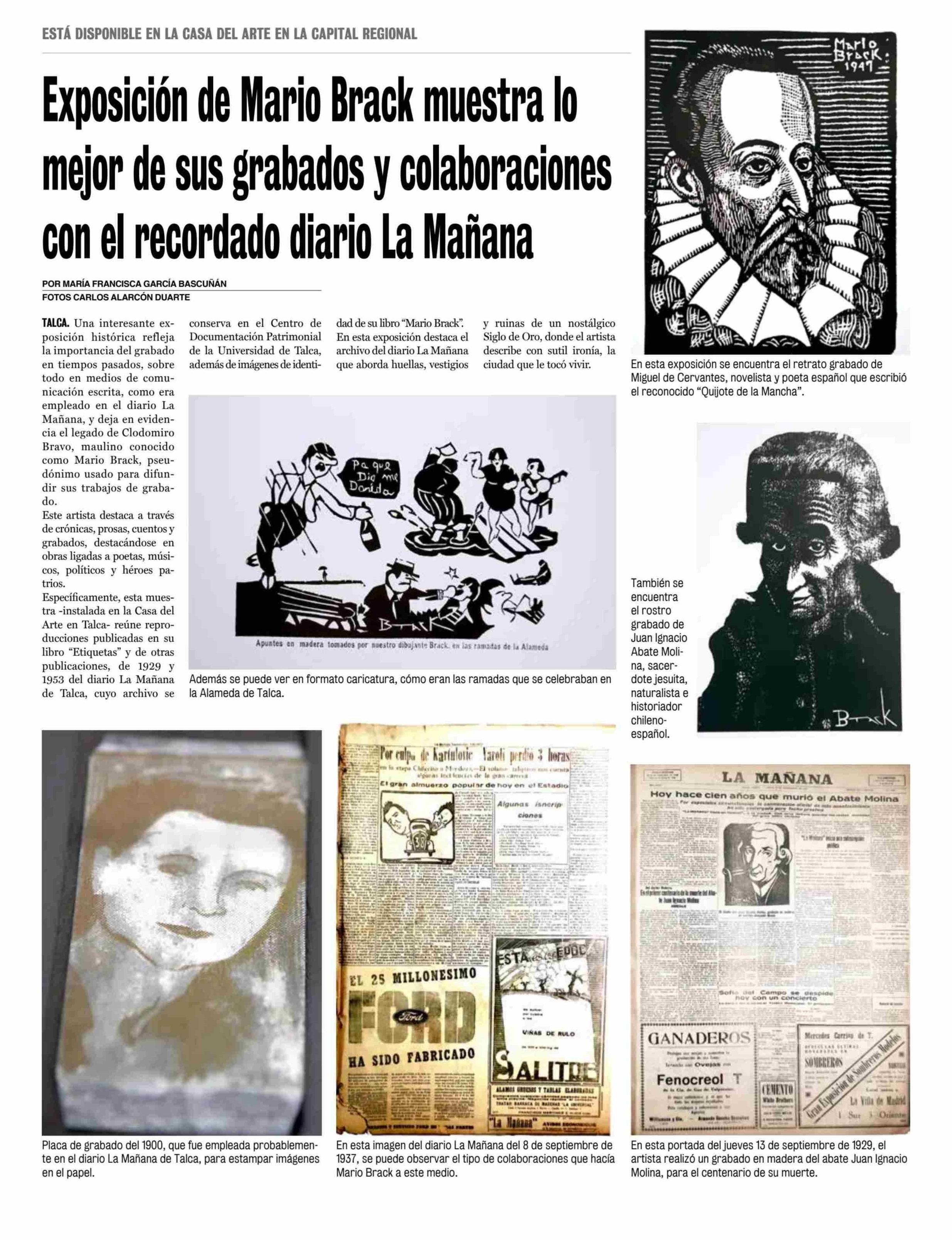 Exposición de Mario Brack muestra lo mejor de sus grabados y colaboraciones con el recordado diario La Mañana. Se menciona la Universidad de Talca.