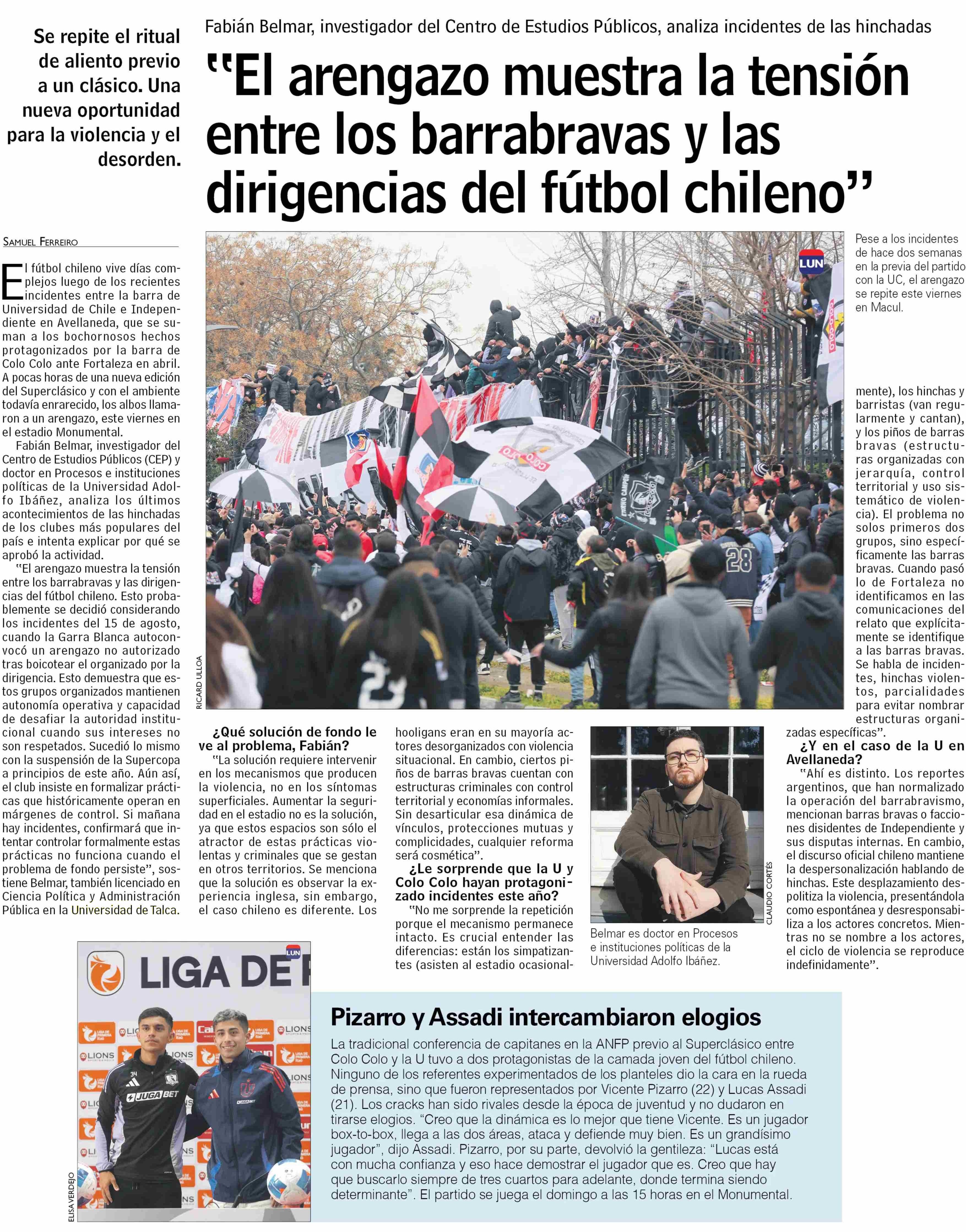 “El arengazo muestra la tensión entre los barrabravas y las – dirigencias del fútbol chileno”. Se refiere Fabián Belmar, investigador del Centro de Análisis Político (CAP-UTalca)