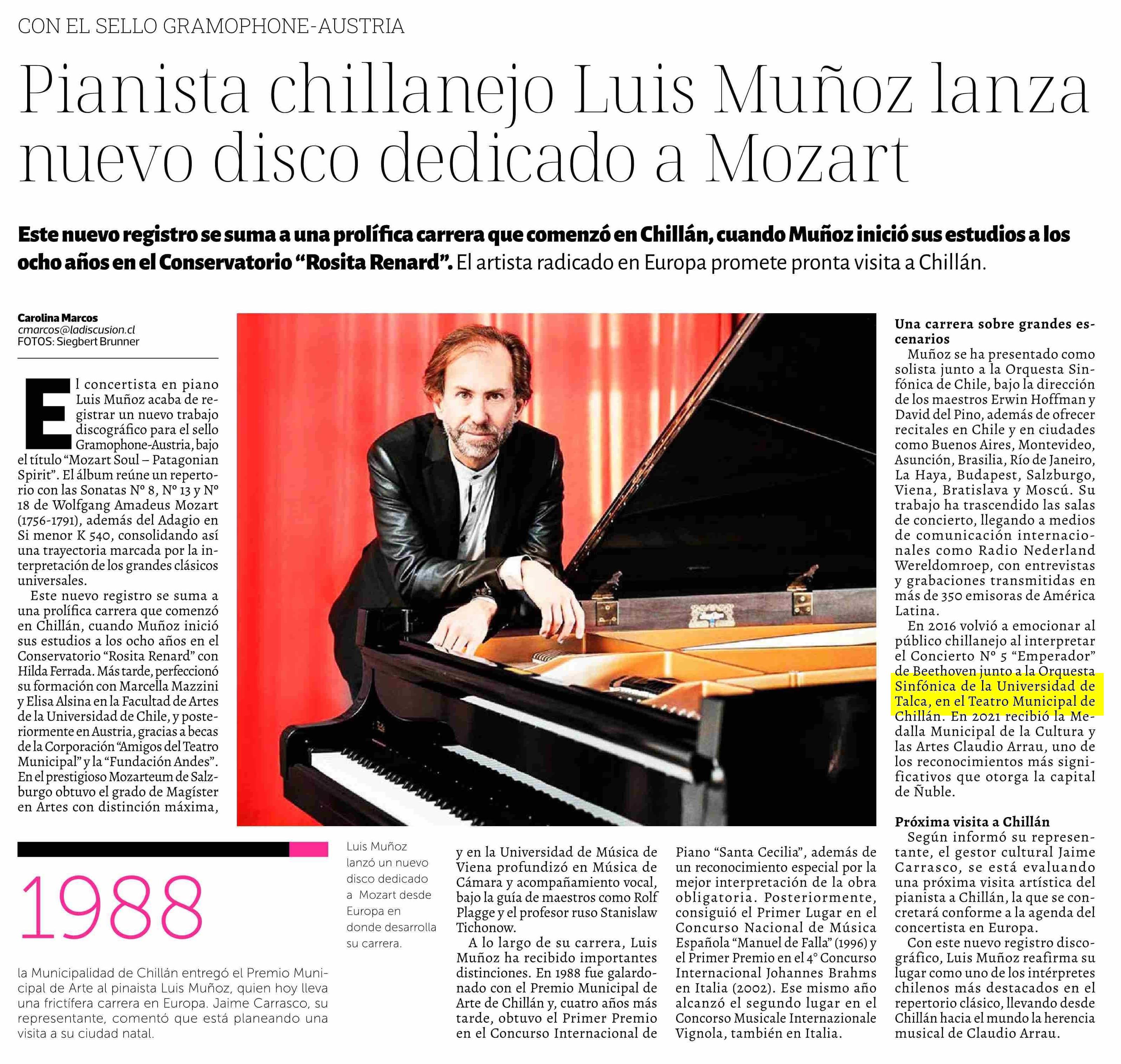 Pianista chillanejo Luis Muñoz lanza nuevo disco dedicado a Mozart. Se menciona la Universidad de Talca.
