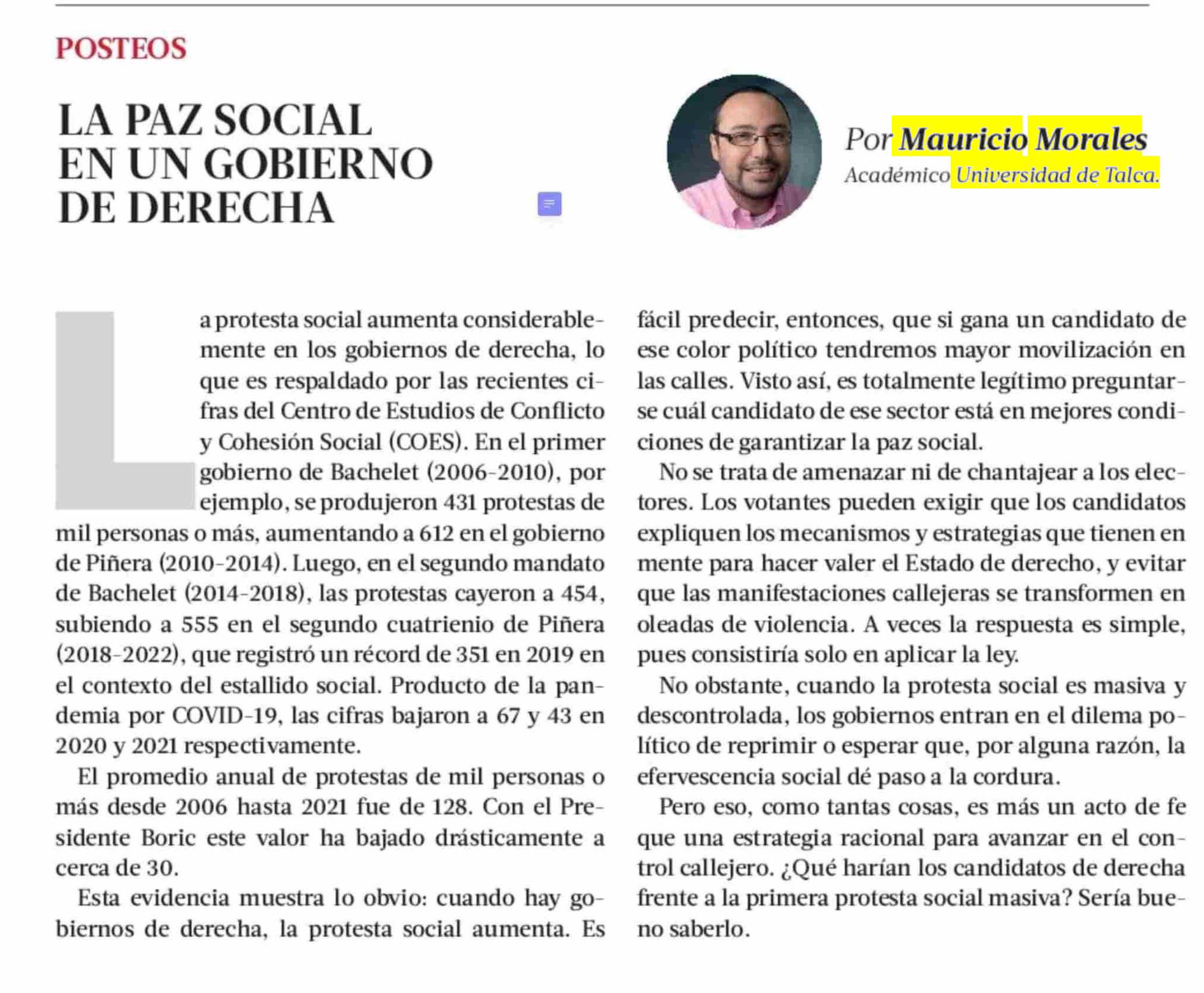 La paz social en un gobierno de derecha. Se refiere Mauricio Morales Quiroz, director del Centro de Análisis Político (CAP-UTalca).